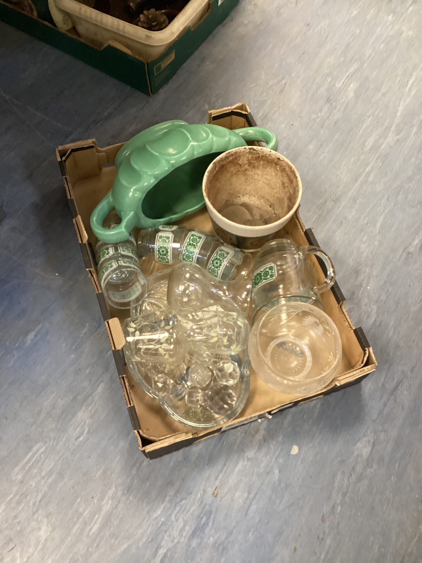 This mixed lot features a collection of vintage glassware alongside a charming stoneware vase. The glassware includes various sizes and styles of glasses, suggesting a potential use for beverages or display. The stoneware vase adds a rustic touch, offering a contrast in texture and material to the delicate glass pieces. This collection would be ideal for collectors of vintage homewares or those looking to add a touch of retro charm to their home.