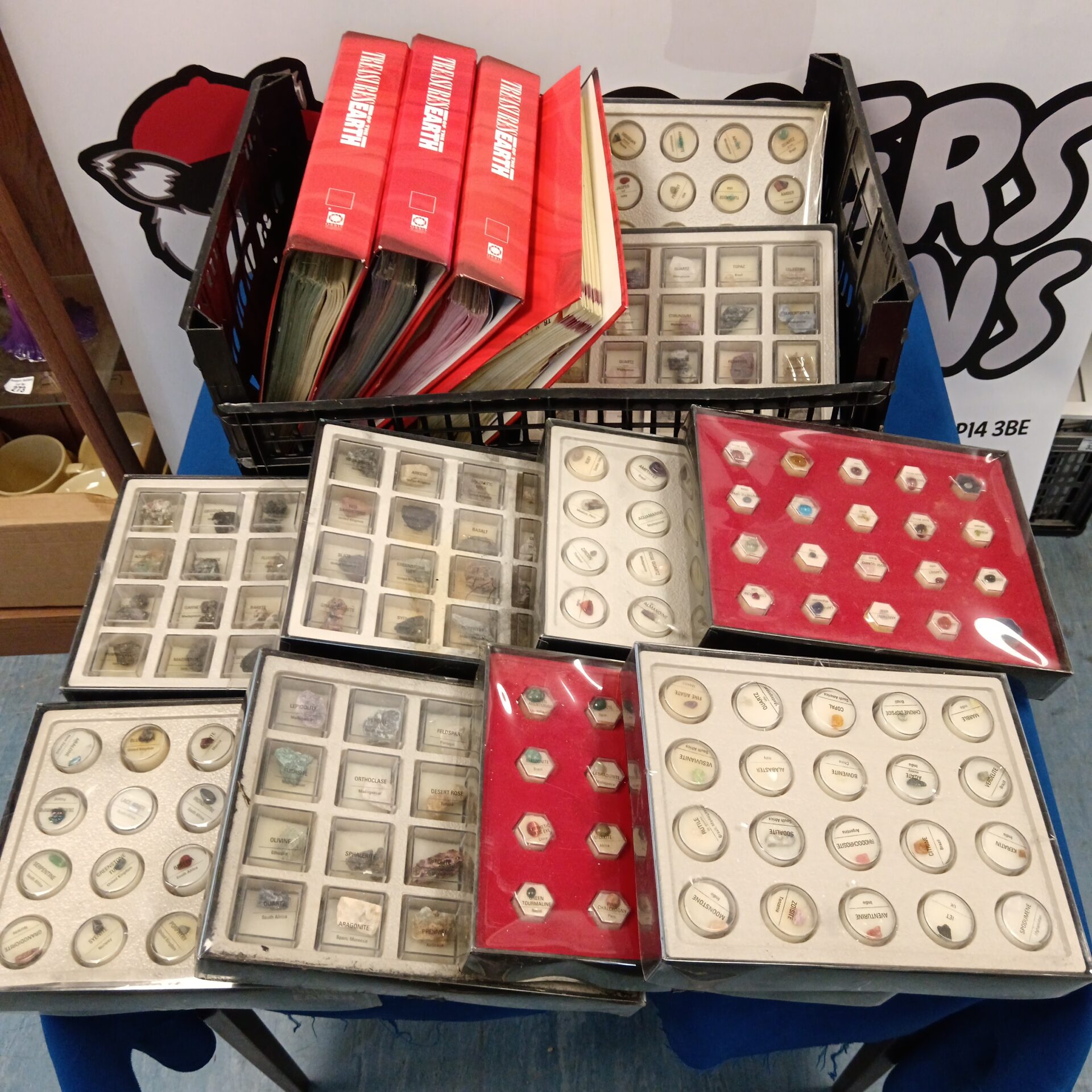 This extensive collection comprises multiple binders of *Treasure Earth* magazines, alongside a substantial assortment of semi-precious gemstones and crystals. The gemstones are neatly displayed in a series of clear plastic trays, each containing a variety of polished stones and mineral specimens. The magazines likely contain detailed information about these stones, creating a comprehensive resource for collectors and enthusiasts.