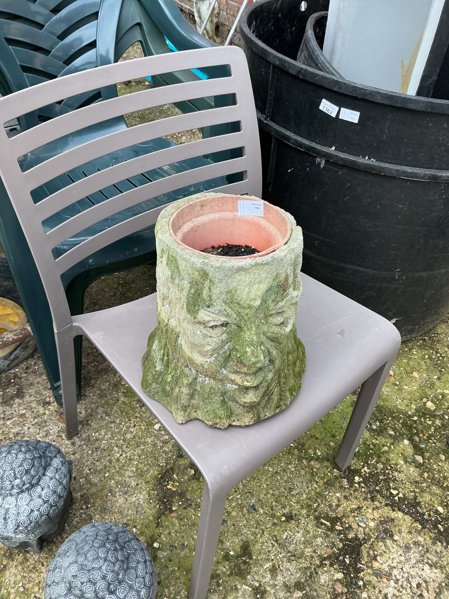 This planter shows signs of weathering and use, consistent with an outdoor item. The stone effect finish is intact, and while there may be minor imperfections, these contribute to the planter’s character. This piece would appeal to collectors of garden ornaments or those seeking a unique and eye-catching addition to their outdoor décor.