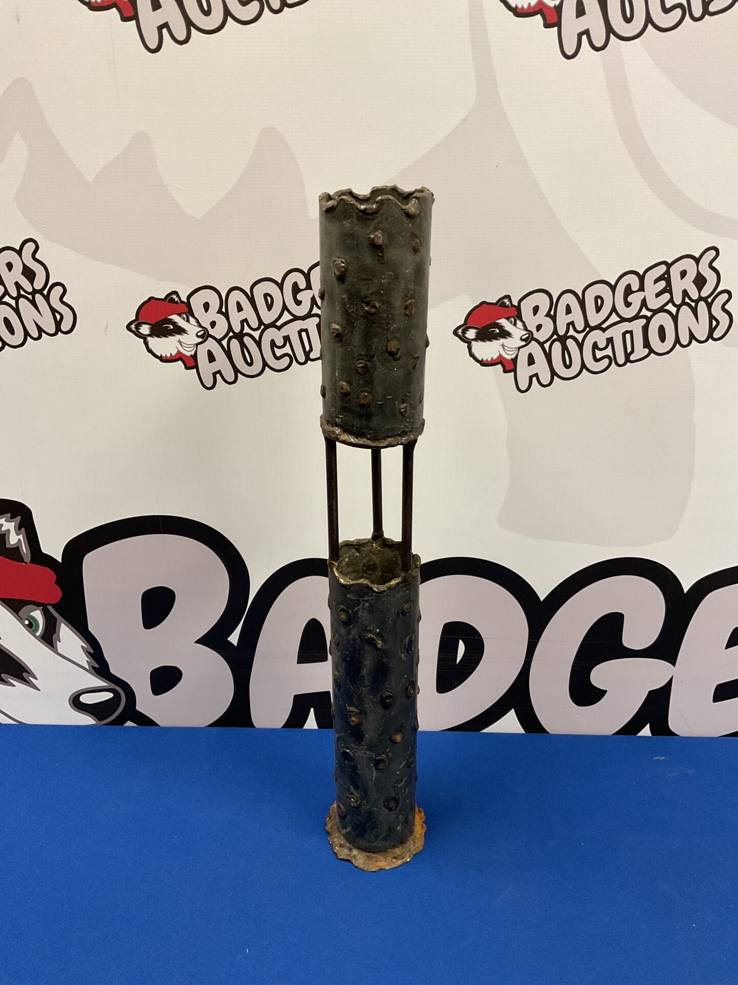 This striking candlestick is a unique example of trench art, skillfully crafted from welded iron. The piece exhibits a rustic, folk art aesthetic, likely created by a resourceful individual repurposing metal materials. The design features a sturdy base and a cylindrical body, culminating in a flared holder for a candle. It’s a testament to ingenuity and resourcefulness, transforming scrap metal into a functional and decorative object.