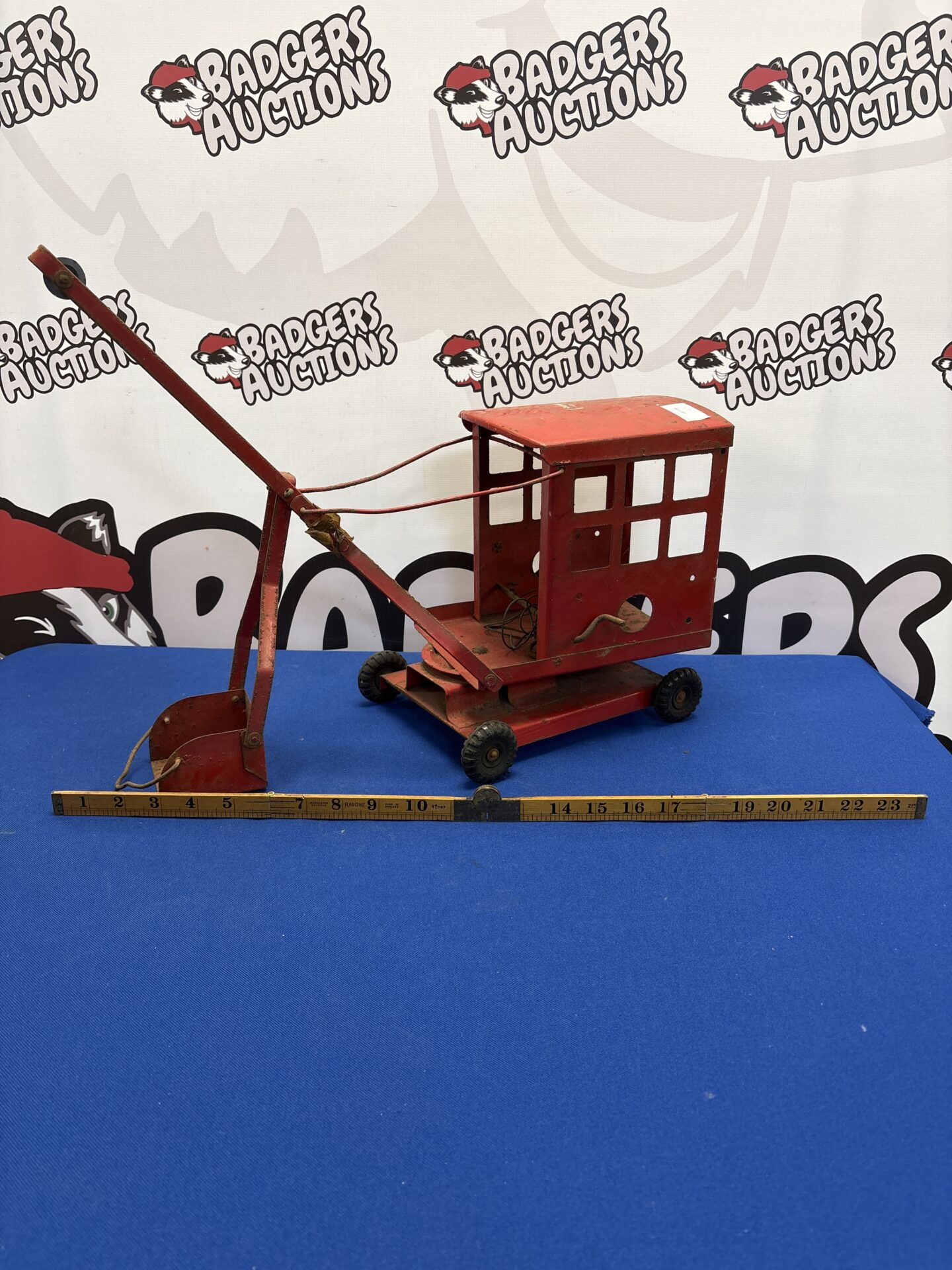 This Triang mobile crane exhibits signs of age and use, consistent with a vintage toy. The tinplate shows some wear and minor paint loss, adding to its character. This crane would be a desirable addition to a collection of vintage toys, tinplate models, or Triang memorabilia, appealing to collectors and enthusiasts alike.