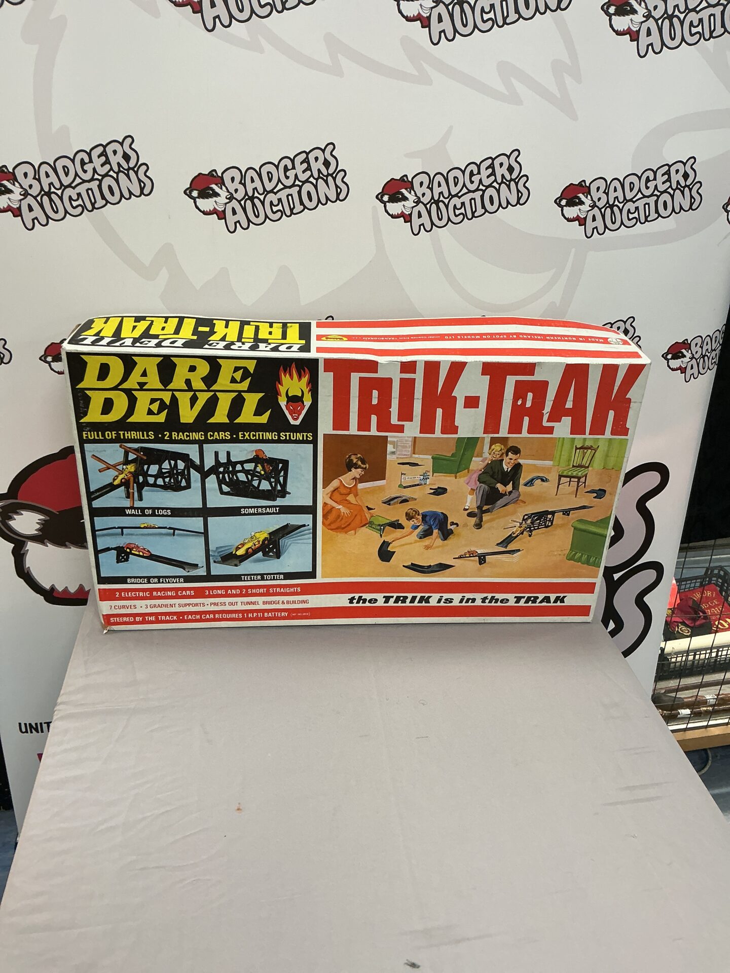 This is a fantastic vintage Trik-Track Dare Devil Set, a thrilling toy from the past. This set features a dynamic track layout designed for high-speed action and daring stunts. The set includes the track pieces, allowing for creative configurations and exciting play. It’s a classic example of retro toy engineering, built for hours of entertainment.
