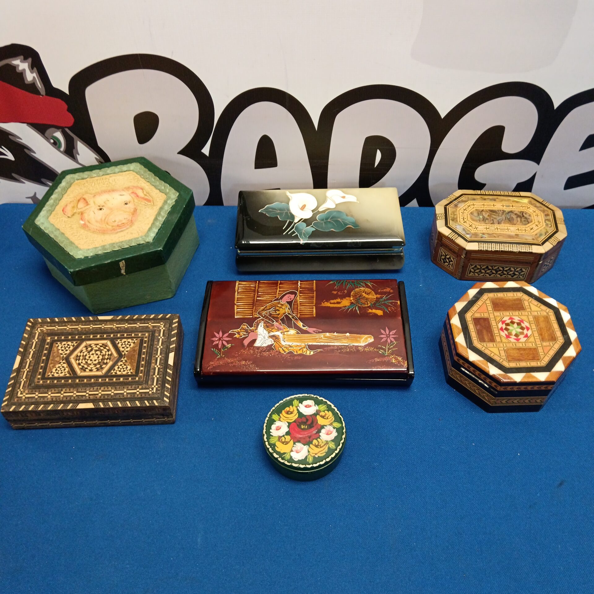 This collection features a variety of small trinket boxes, each with unique materials and designs. The assortment includes boxes crafted from stone and featuring intricate marquetry detailing. These boxes likely served as decorative items for holding small treasures, jewellery, or keepsakes, and represent a diverse range of craftsmanship and aesthetic styles.