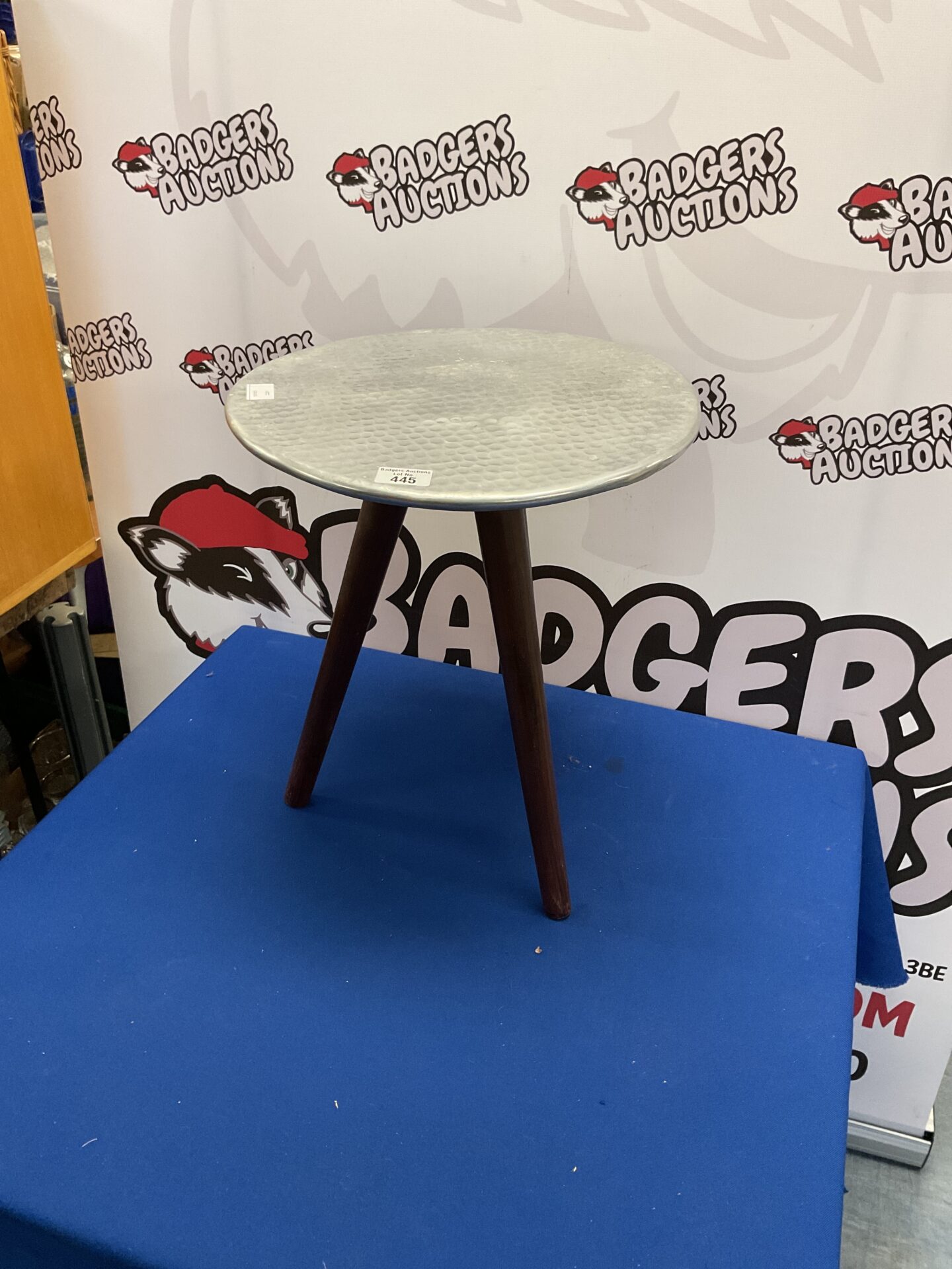 This vintage tripod table boasts a stunning hammered aluminium top and a classic mid-century modern design. Its lightweight yet stable tripod base makes it versatile for use as a side table, plant stand, or display piece. A unique addition to any home, this table offers both style and functionality.
