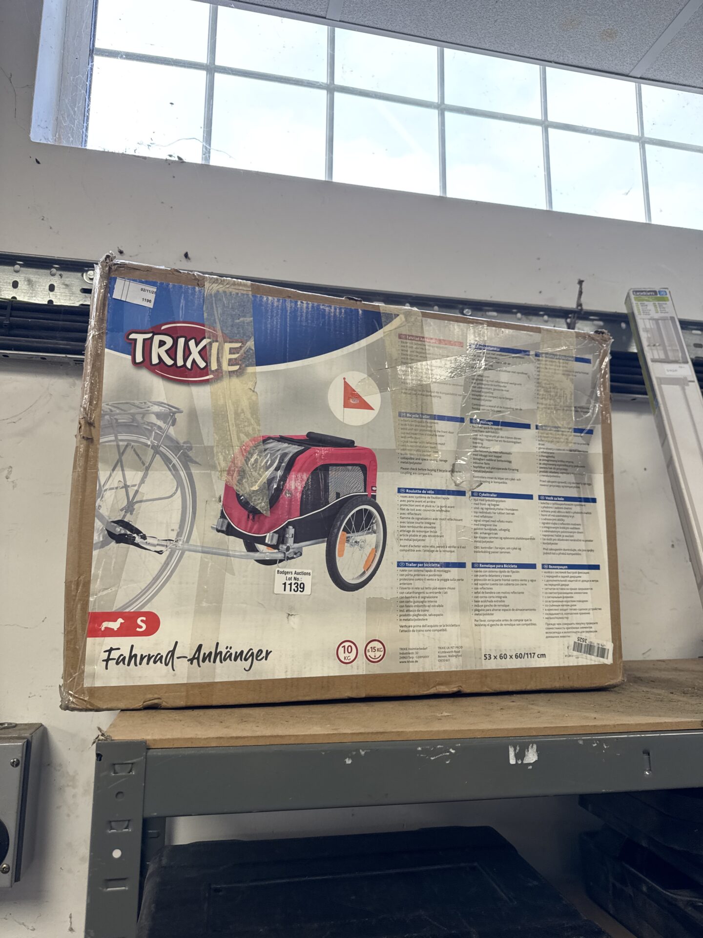 The trailer appears to be used, with signs of wear consistent with normal use. It may require some cleaning or minor repairs. This trailer would appeal to pet owners who enjoy cycling and want a safe and convenient way to transport their small animals, or a collector of pet accessories.