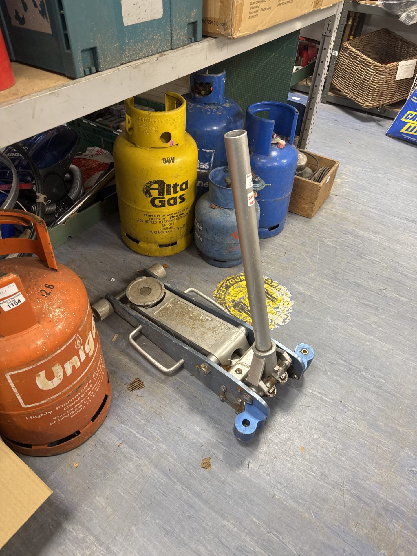 This lot comprises a large trolley jack, intended for use in automotive repair and maintenance. The jack features a heavy-duty steel construction, designed to lift vehicles for tasks such as tyre changes or undercarriage work. It appears to be a robust piece of equipment, though currently in need of attention.