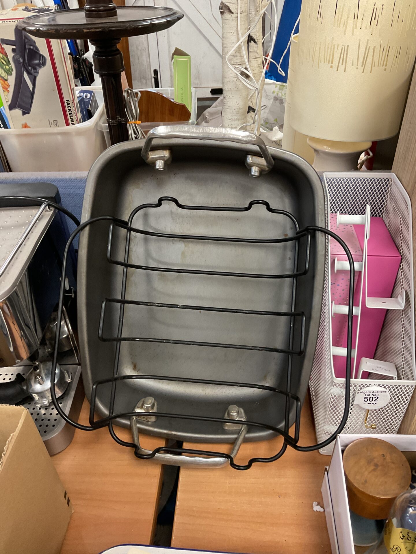 This roasting tin shows signs of use, with some discoloration and wear to the metal. It is offered in its original condition, and while it may require cleaning, it remains a functional piece of kitchen equipment. This tin would be of interest to collectors of vintage kitchenware or those seeking a robust, traditional roasting solution.