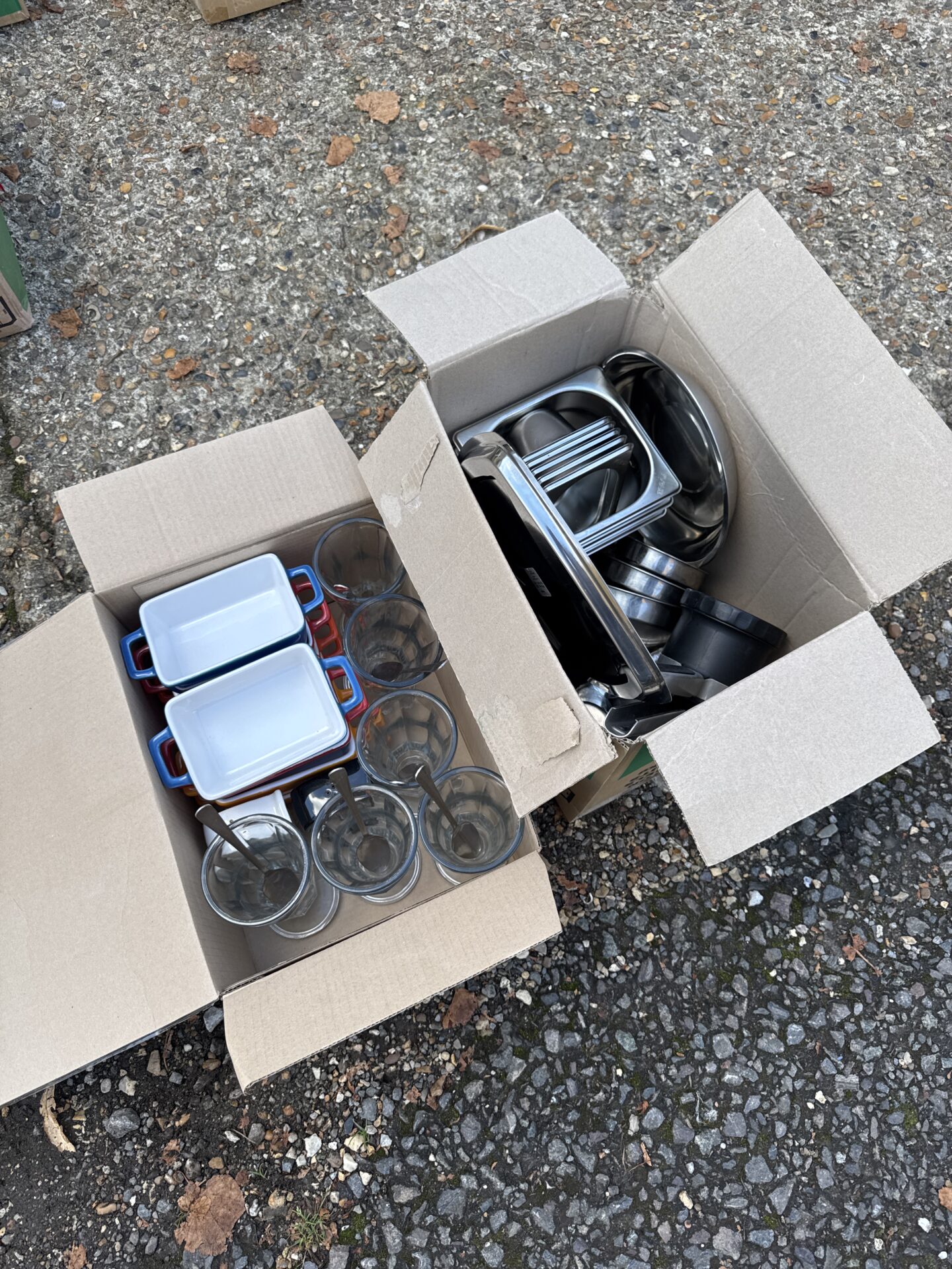 473 Two Boxes Of Mixed Kitchen Items Inc Stainless Steel, Sundae Glasses & Small Cooking Trays