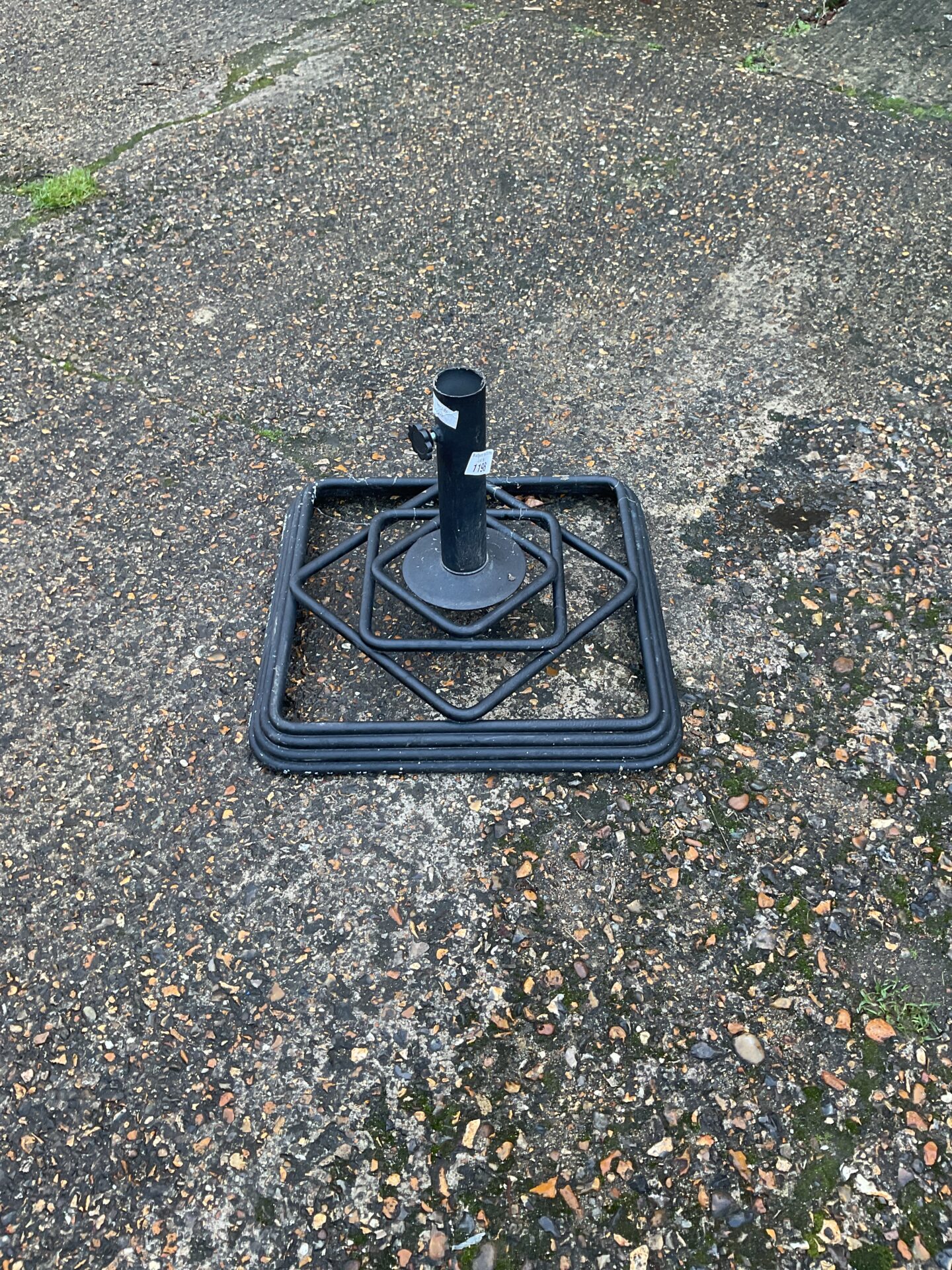 This umbrella base presents as found, with signs consistent with outdoor display and use. While it may exhibit some weathering or minor imperfections, these contribute to its character and patina. Collectors and buyers seeking a functional and aesthetically pleasing outdoor accessory will appreciate its solid construction and classic design. This piece offers a blend of practicality and style for any patio or garden setting.