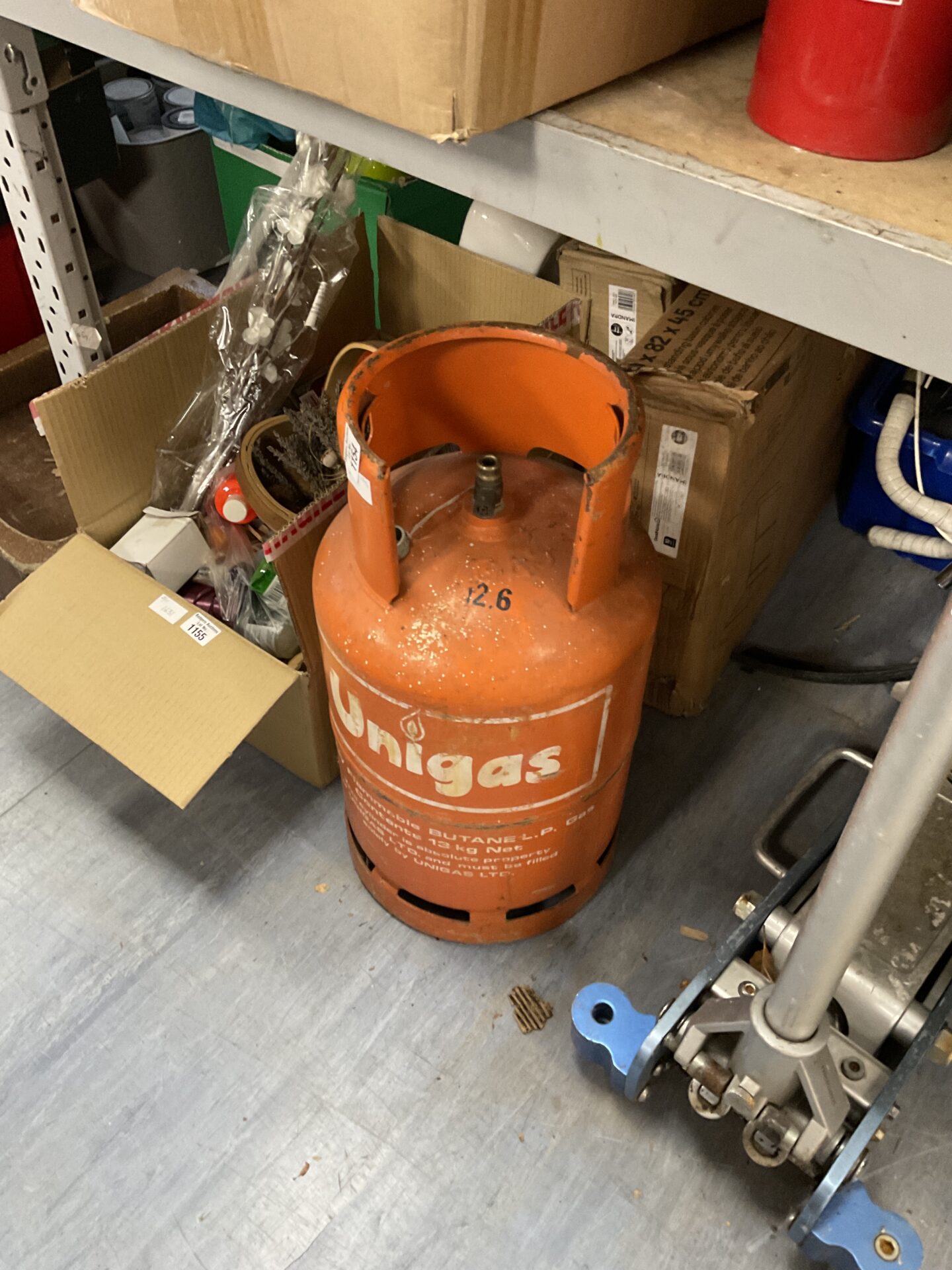 This is a used Unigas patio gas canister, designed for use with outdoor heating or cooking appliances. The canister is a standard size for portable gas applications and features a valve for connection to compatible equipment. It is constructed from metal, typical for gas storage, and shows signs of previous use.