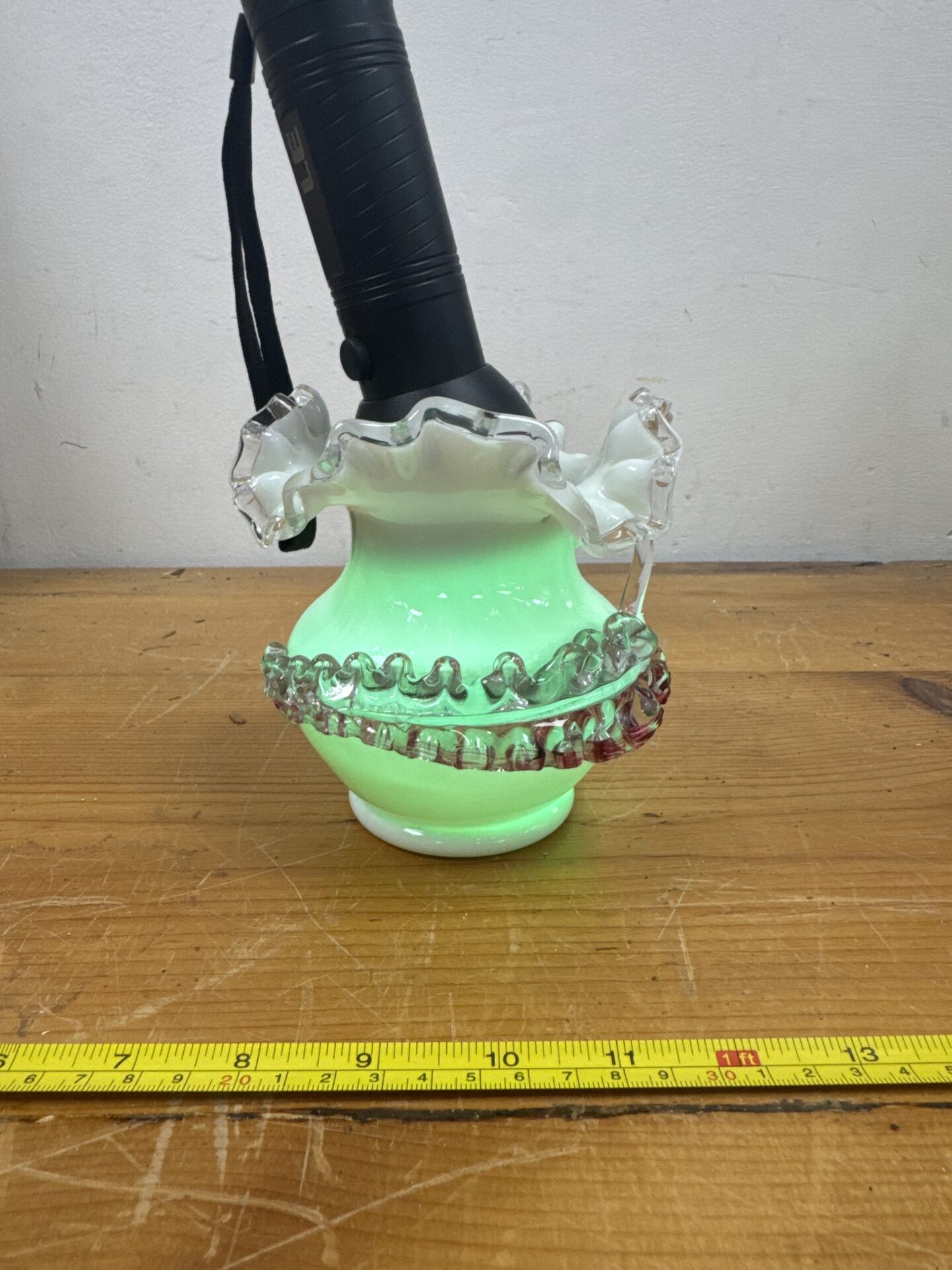 The vase is in good vintage condition, with no major chips or cracks. There may be some minor wear consistent with age and use, but this adds to its character and authenticity. Uranium glass pieces like this are increasingly popular with collectors due to their rarity and unique aesthetic, making this a desirable addition to any collection or a beautiful statement piece for the home.