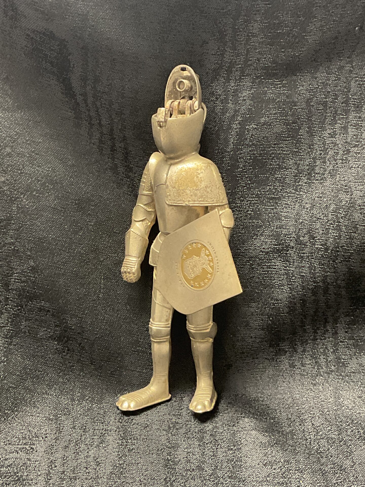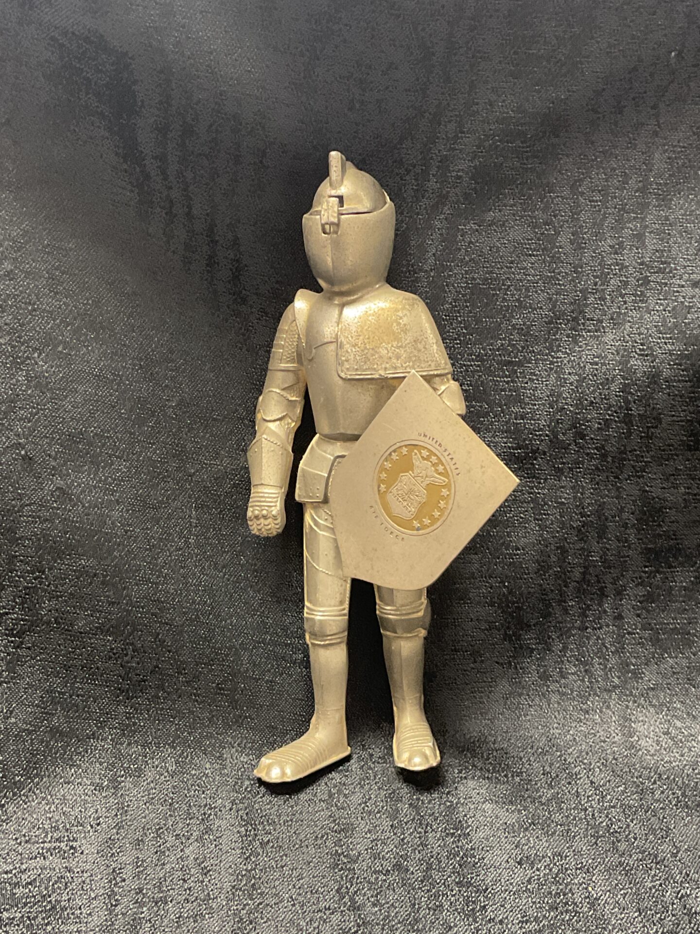 This is a striking whitemetal table petrol lighter, sculpted in the form of a US Air Force Knight in full armour. The figure stands proudly, holding a shield bearing the Air Force emblem. This lighter is a detailed and unusual piece, likely produced as a commemorative or promotional item, and showcases a classic representation of military honour and service.