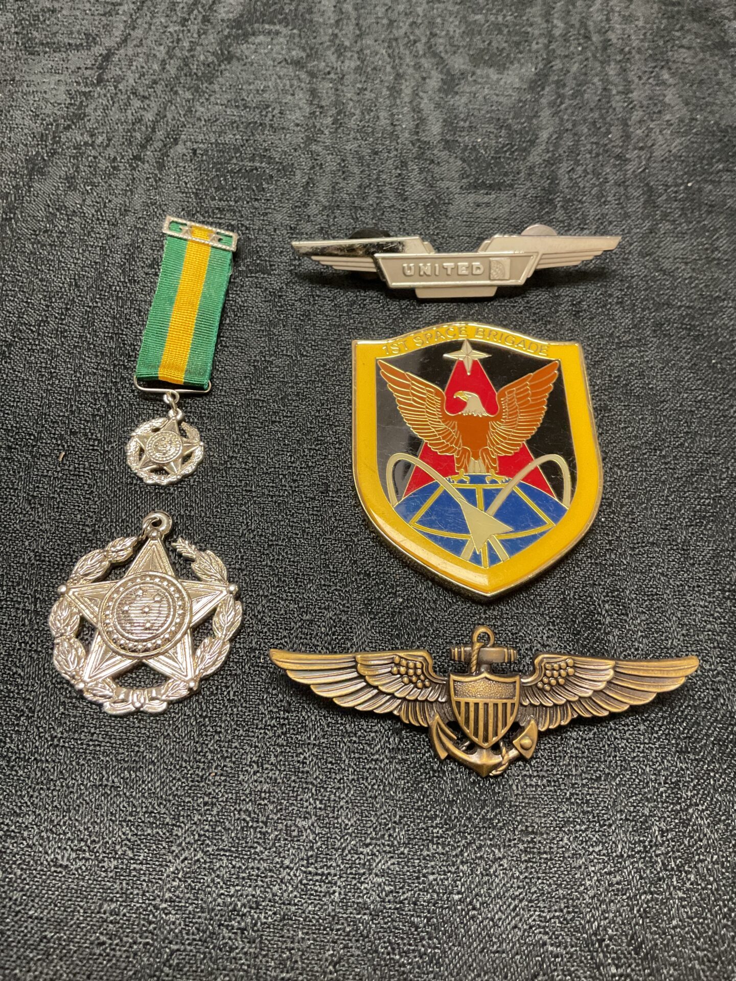 The badges and medals present varying degrees of wear consistent with their age and potential use. While a detailed assessment of each individual piece is not possible without physical inspection, the collection as a whole is of interest to collectors of military and aviation memorabilia. The combination of US Navy and United Airlines items makes this a unique and potentially valuable lot for enthusiasts of both fields.
