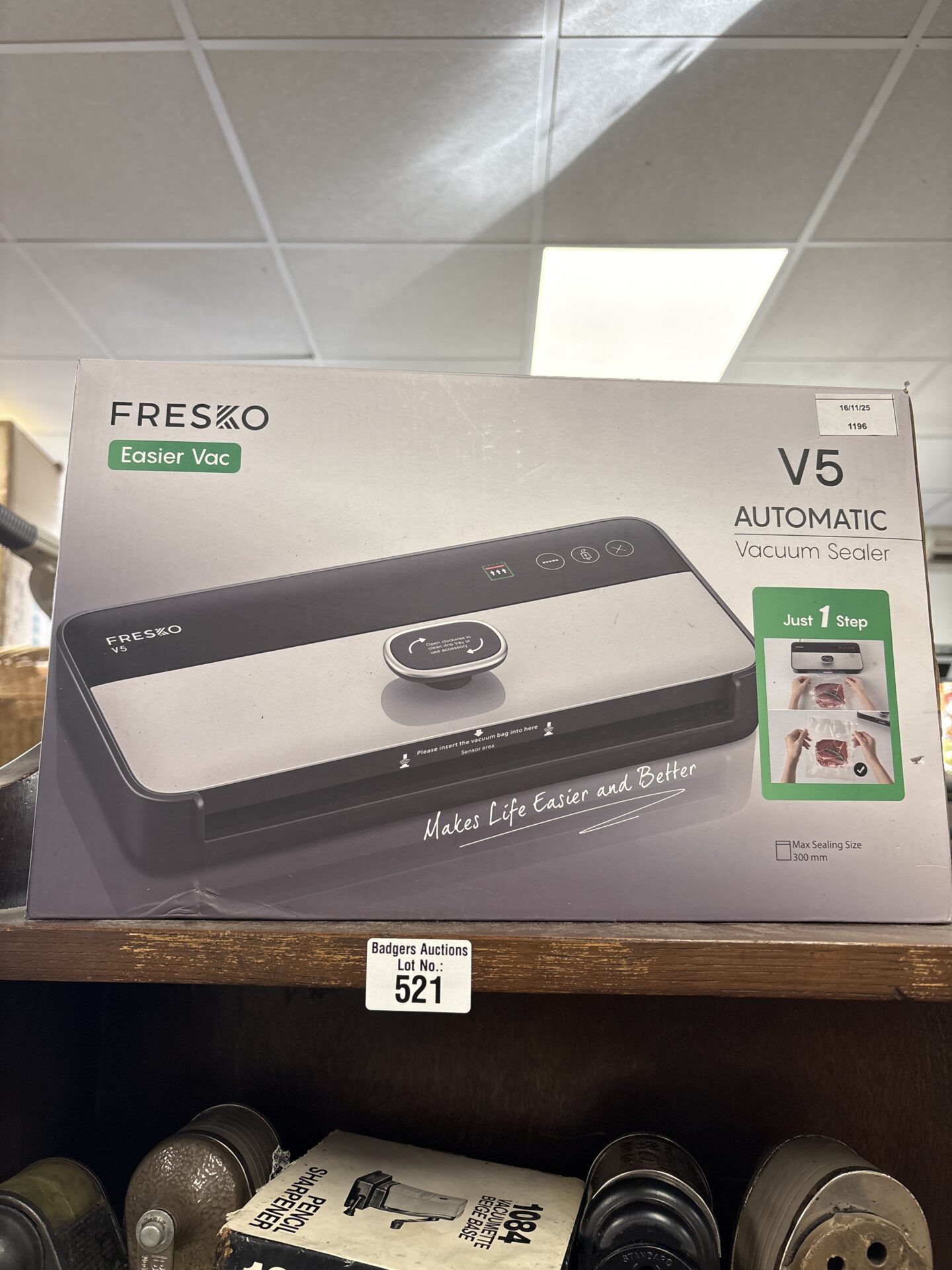 This is a Fresco V5 Automatic Vacuum Sealer, designed for preserving food and extending its shelf life. This countertop appliance features automatic operation, simplifying the sealing process. Its sleek design makes it a practical addition to any kitchen, offering a convenient solution for food storage and preparation.