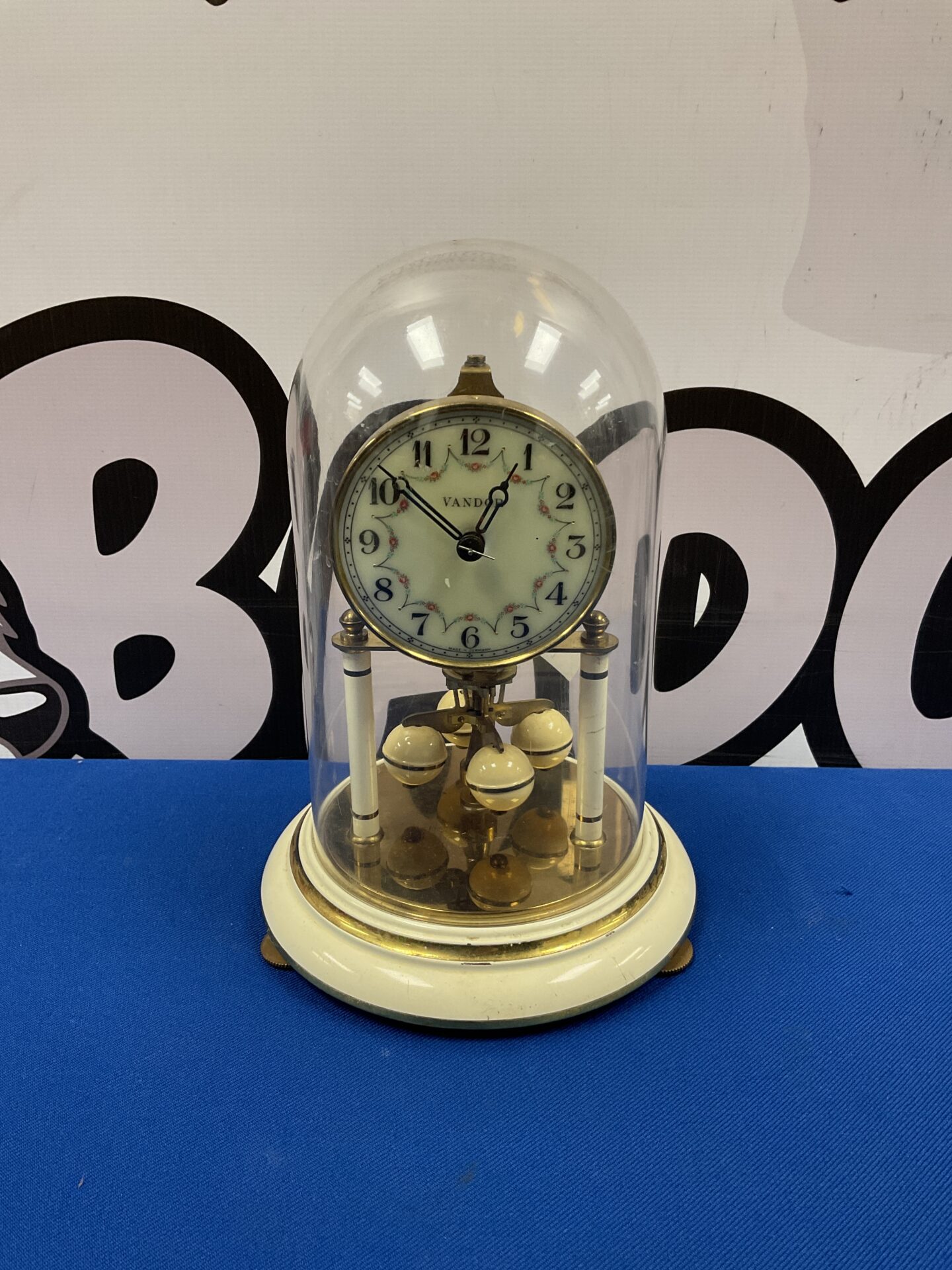 This is a Vandor torsion clock, featuring a clear dome enclosure that showcases the movement. The clock is powered by a torsion pendulum, visible within the dome, and is driven by a J Link & Co movement, manufactured in Schwenningen. The base is constructed of a light-coloured material, providing a stable platform for the clock’s intricate mechanism and elegant design.