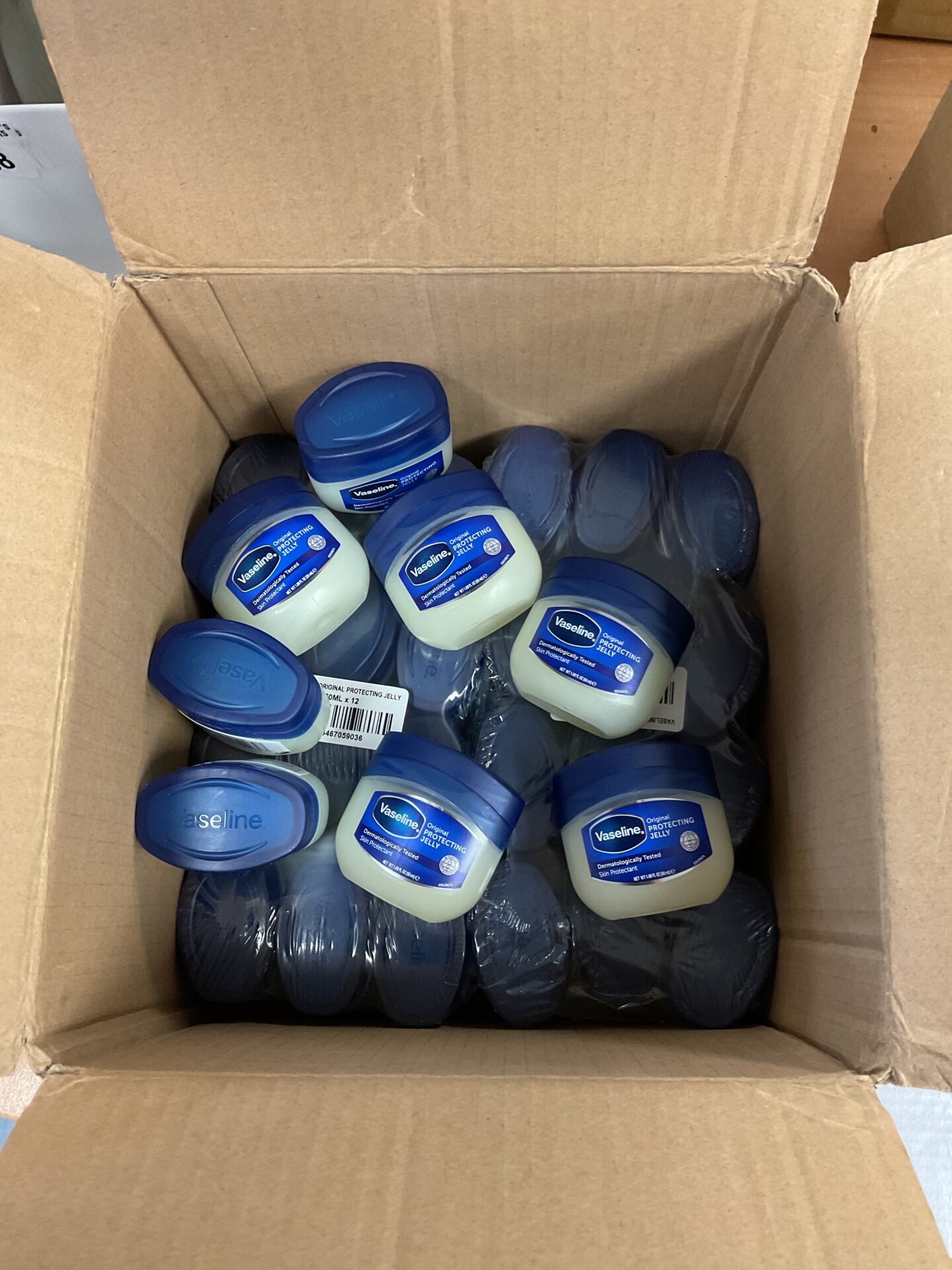 This is a bulk lot of 32 tubs of Vaseline Original Protecting Jelly. Each tub contains a classic formulation of petroleum jelly, designed to moisturize and protect skin. This is a staple product for many, known for its versatility in skincare and everyday use.