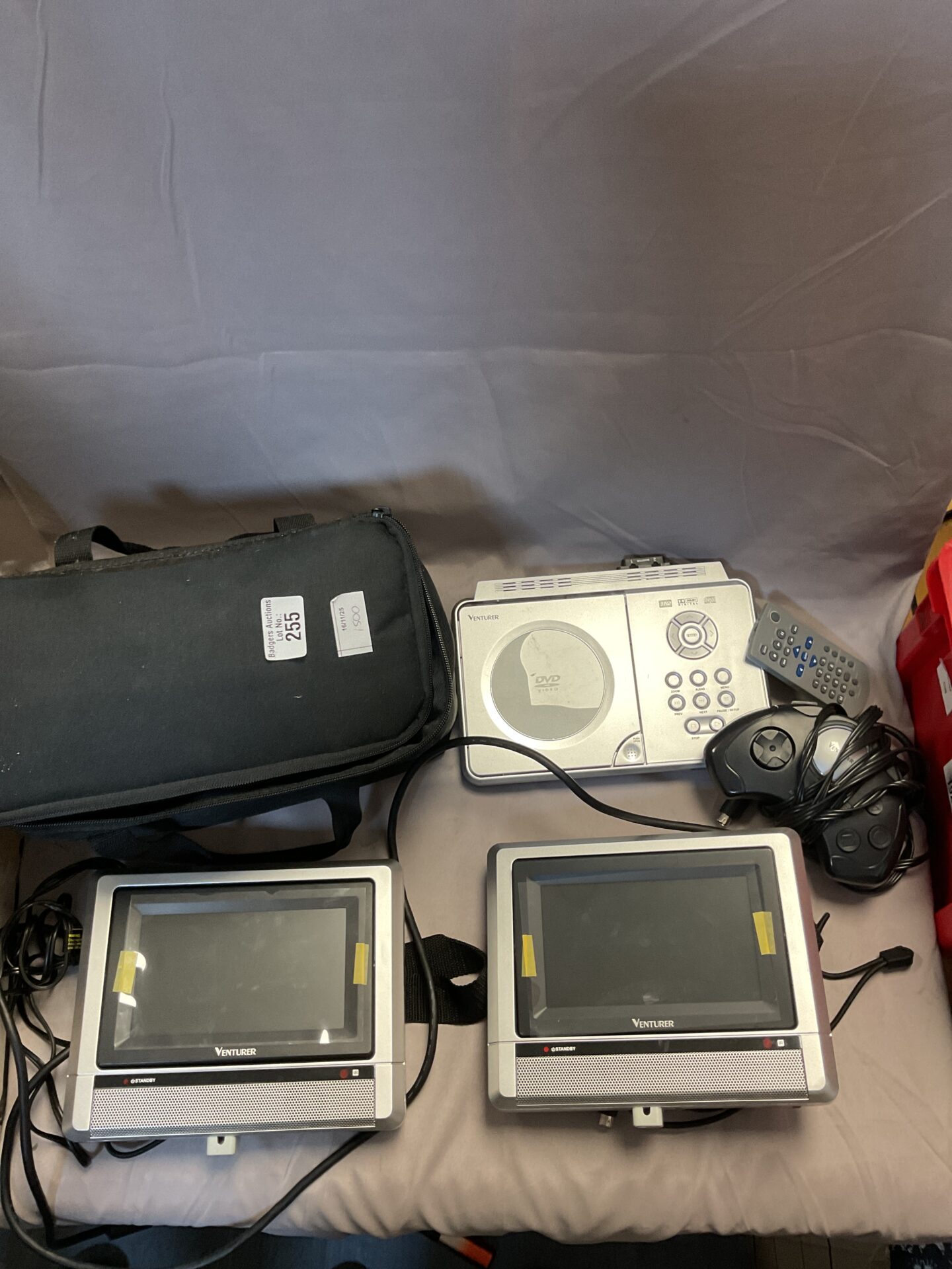 This lot features a Venturer portable DVD player system, complete with two monitors and a controller. The system is designed for on-the-go entertainment, offering a compact and convenient way to enjoy movies and media. The inclusion of dual screens allows for shared viewing or individual entertainment, making it ideal for car journeys, travel, or home use.