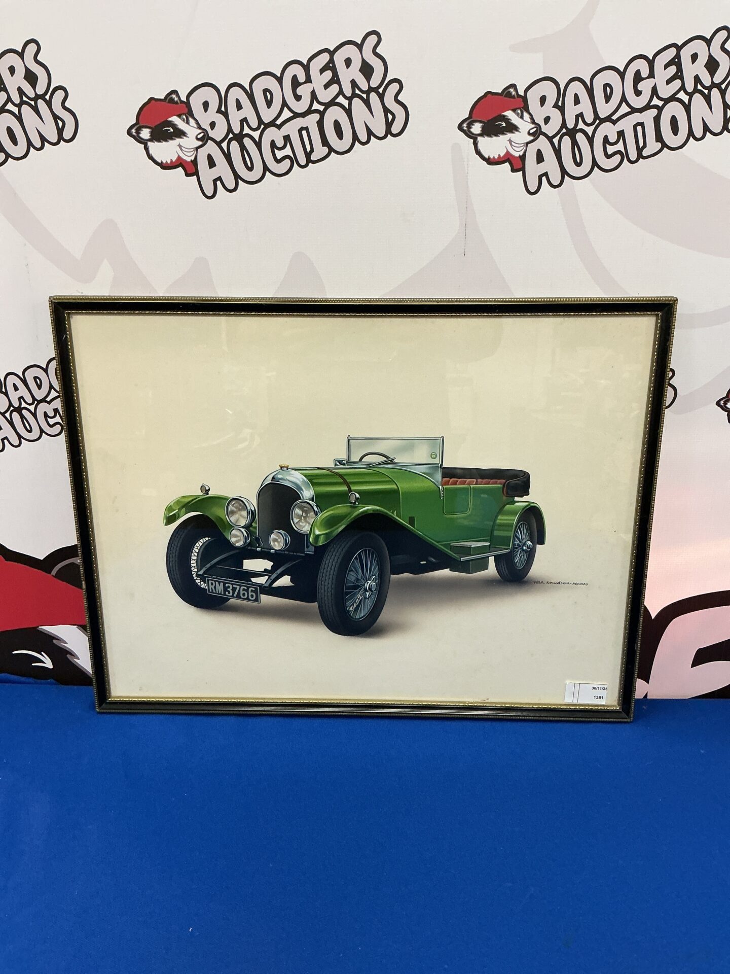 The painting appears to be in good condition, with expected signs of age and wear consistent with a vintage artwork. It would be a desirable addition to a collection of automotive art, vintage paintings, or works by Vera Knudsen. The depiction of the Bentley RM3766 adds to its appeal for car enthusiasts and collectors of classic automobile memorabilia.