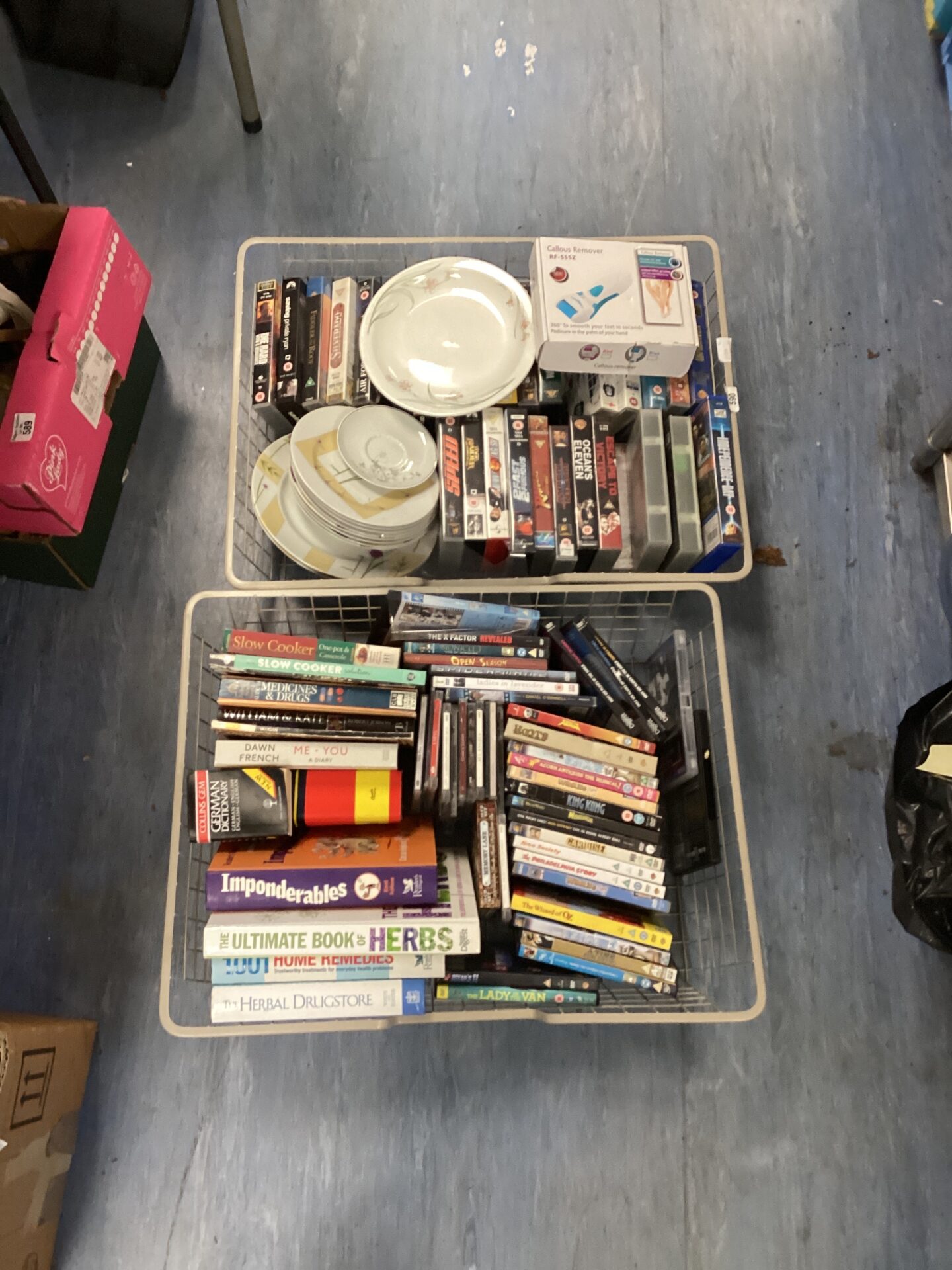 This lot comprises a collection of VHS tapes, DVDs, and Sabichi plates. The media appears to be a varied assortment of films and potentially television shows, offering a nostalgic glimpse into home entertainment from past decades. The inclusion of Sabichi plates adds an unexpected element, suggesting a possible collection or household lot.
