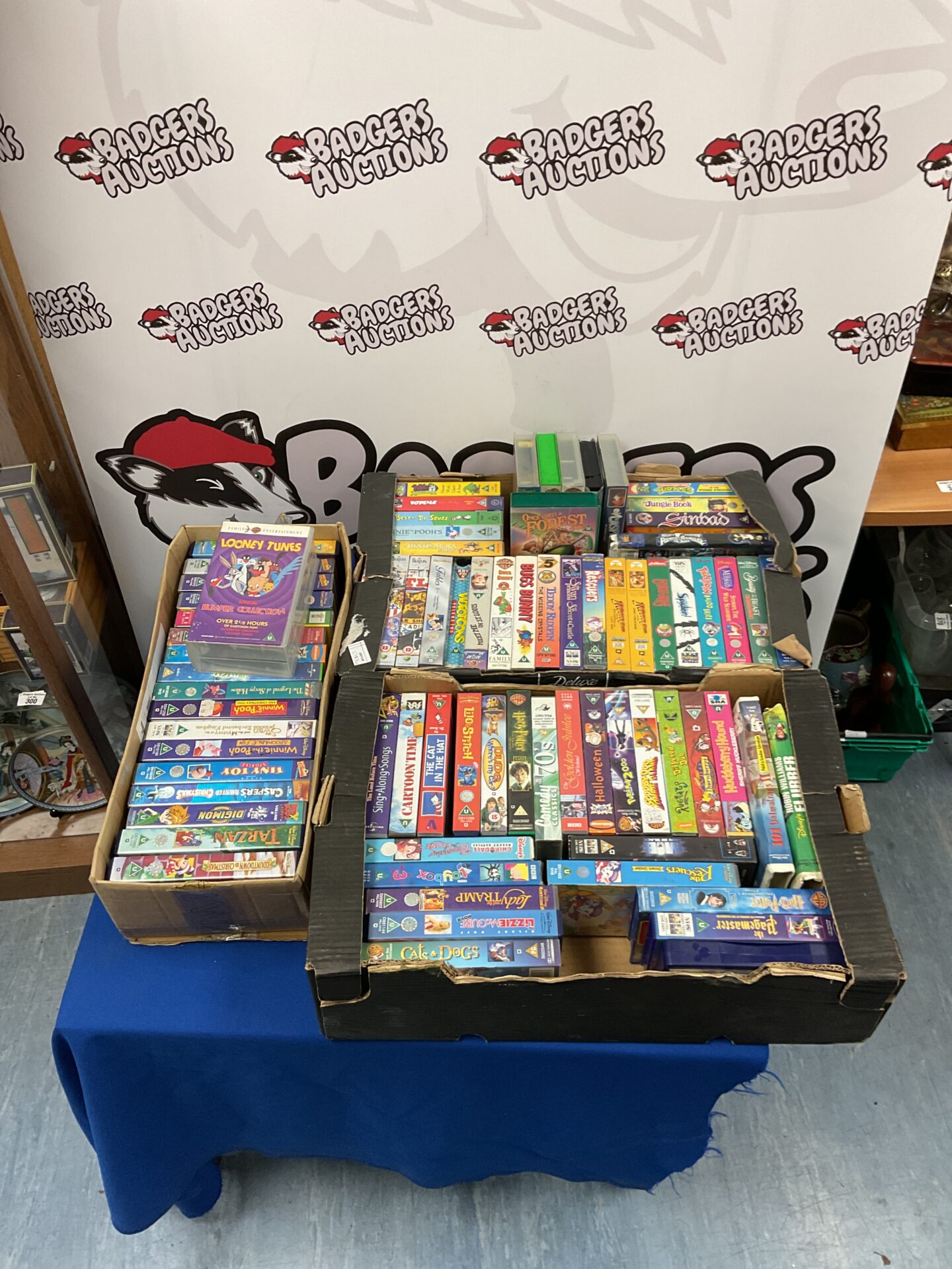 This lot comprises three boxes filled with a variety of VHS tapes. The collection appears to include a range of genres, potentially encompassing movies, television shows, and possibly educational content. The tapes are housed within their original plastic cases, offering a nostalgic glimpse into home entertainment from a bygone era.