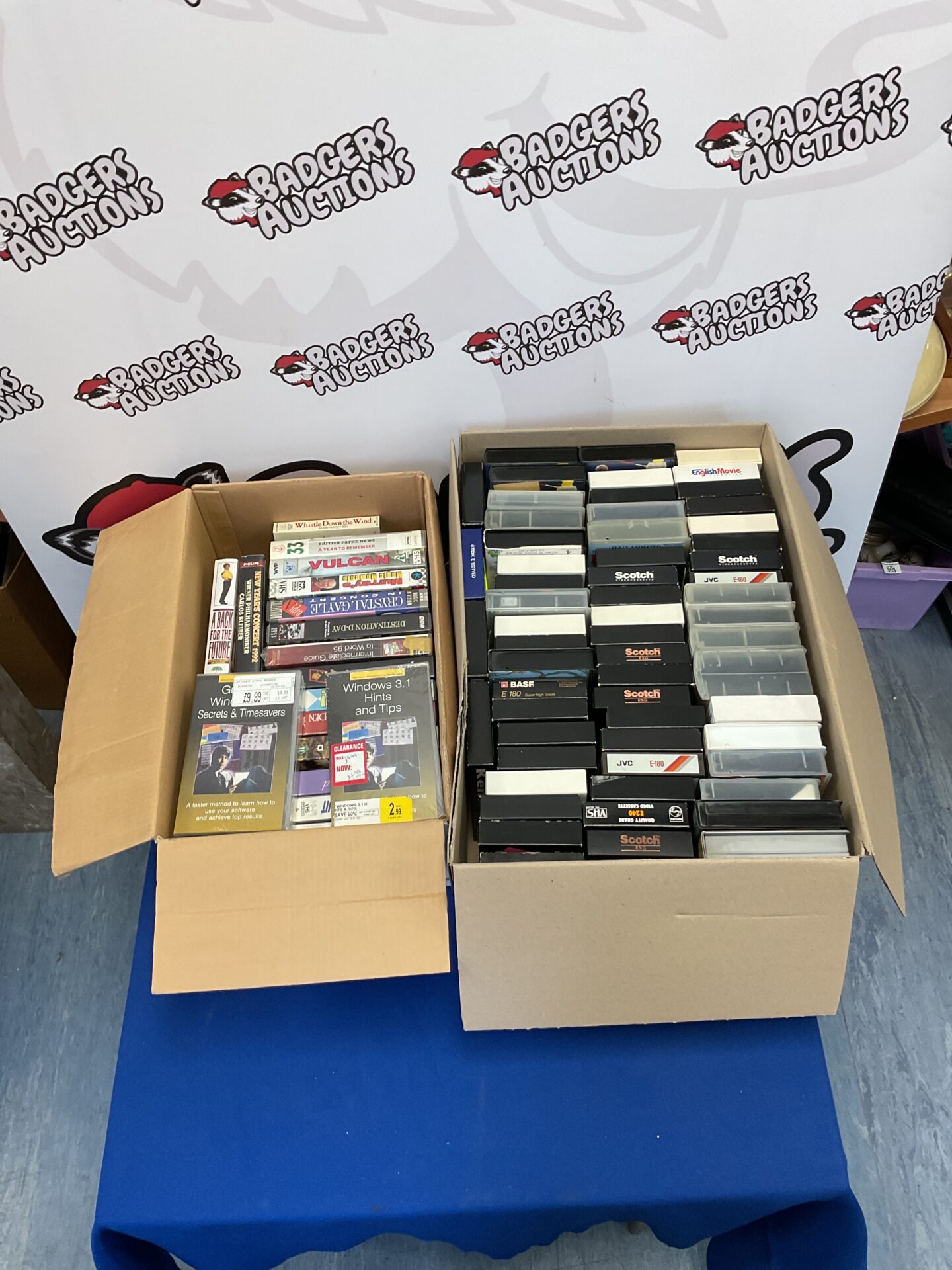 This lot comprises two boxes filled with a variety of VHS tapes from well-known brands like Scotch, TDK, and BASF. These tapes are a nostalgic reminder of a bygone era of home video recording and playback. The collection includes blank tapes, offering potential for recording or preserving older content, and pre-recorded tapes, offering a glimpse into the entertainment of the past.