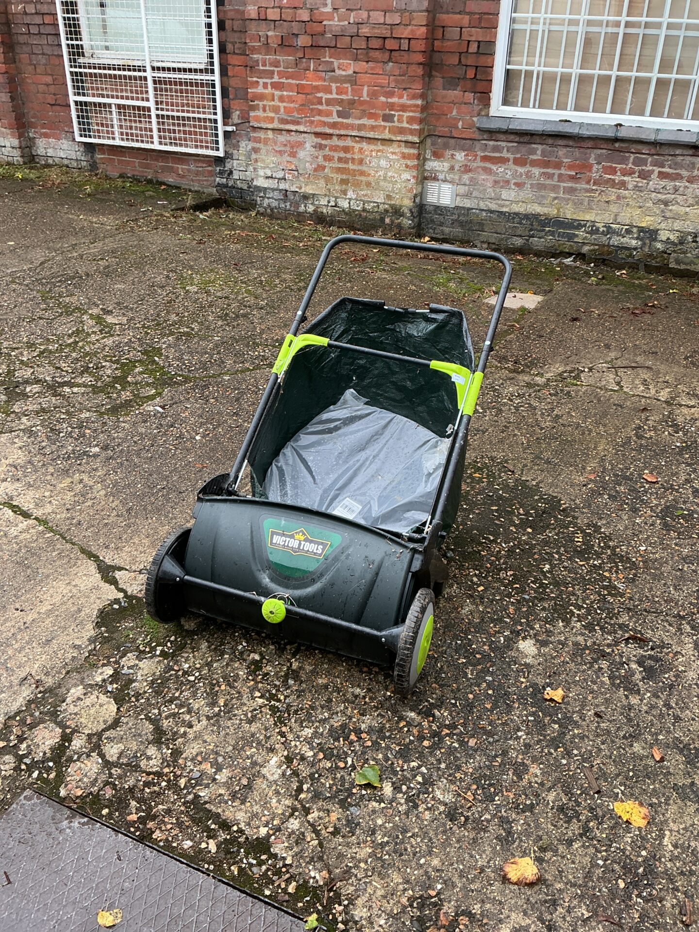 This Victor lawn rake is a practical tool for keeping your garden tidy. Featuring a large collection bag, it efficiently gathers leaves, grass clippings, and other debris. Ideal for garden maintenance or restoration projects, this rake is presented for consideration by collectors and gardeners alike.