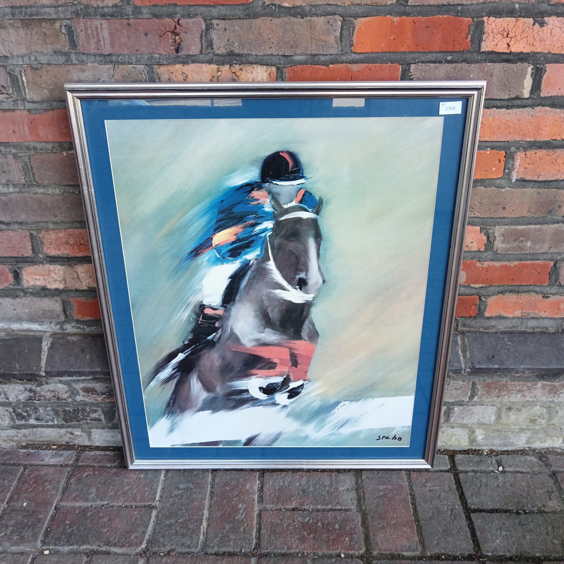 This is a large framed print by Victor Spahn, depicting a dynamic horse racing scene. The artwork showcases Spahn’s signature style, characterised by bold brushstrokes and a focus on movement and energy. The print captures the power and grace of the horses as they compete, with a vibrant colour palette enhancing the dramatic effect. It is a striking piece that would make a statement in any room.