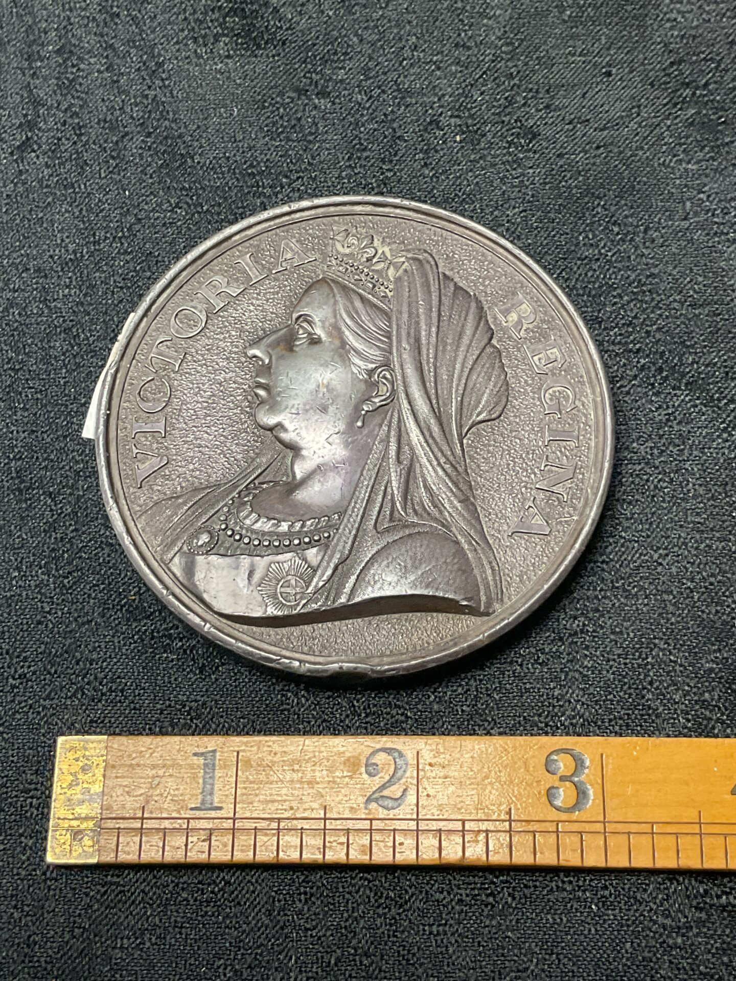 The medal shows signs of age and wear, with some surface scratches and patina consistent with its age. Despite this, the detail of the portrait and inscription remain remarkably clear. This piece would be a desirable addition to a collection of Victorian memorabilia, British historical artifacts, or commemorative medals. Its size and relatively good condition make it a standout piece for display or further research.