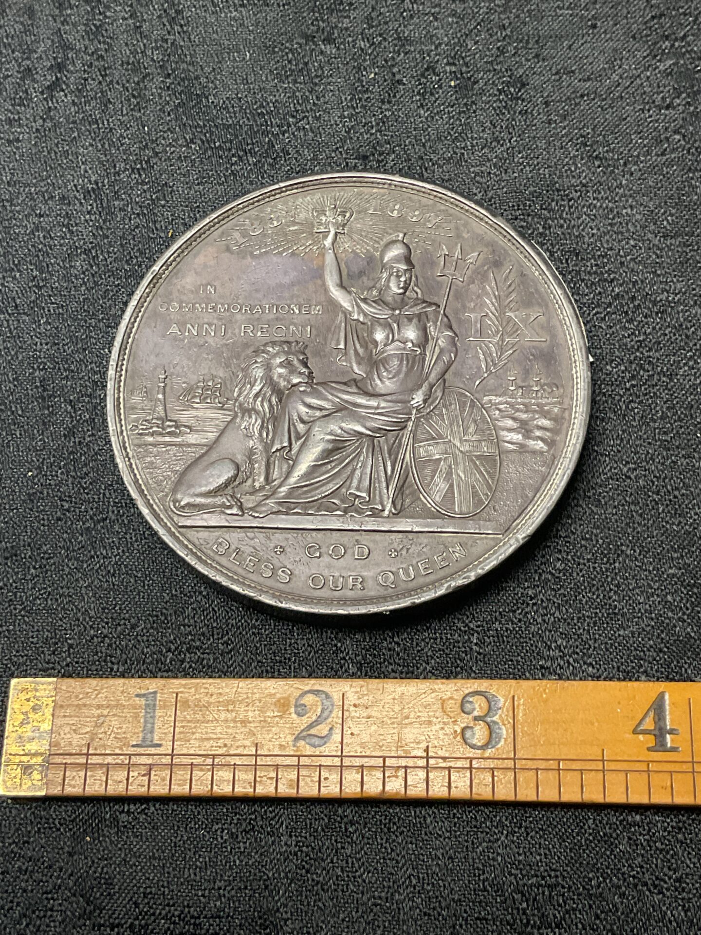 This is a large, circular pewter medallion commemorating Queen Victoria’s Diamond Jubilee. The obverse features a profile portrait of Queen Victoria, adorned with a crown and veil, encircled by the inscription “VICTORIA REGINA”. The detailed craftsmanship and substantial size of this medal suggest it was a significant commemorative piece produced during a period of national celebration. The medal’s design reflects the Victorian aesthetic, emphasizing regal portraiture and elegant lettering.