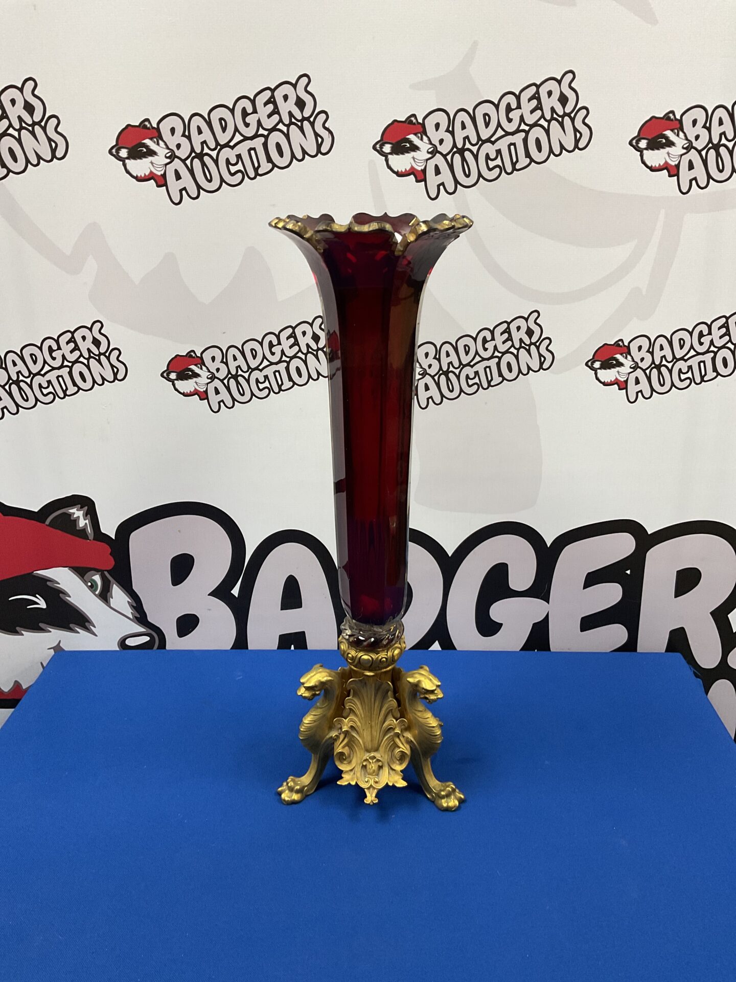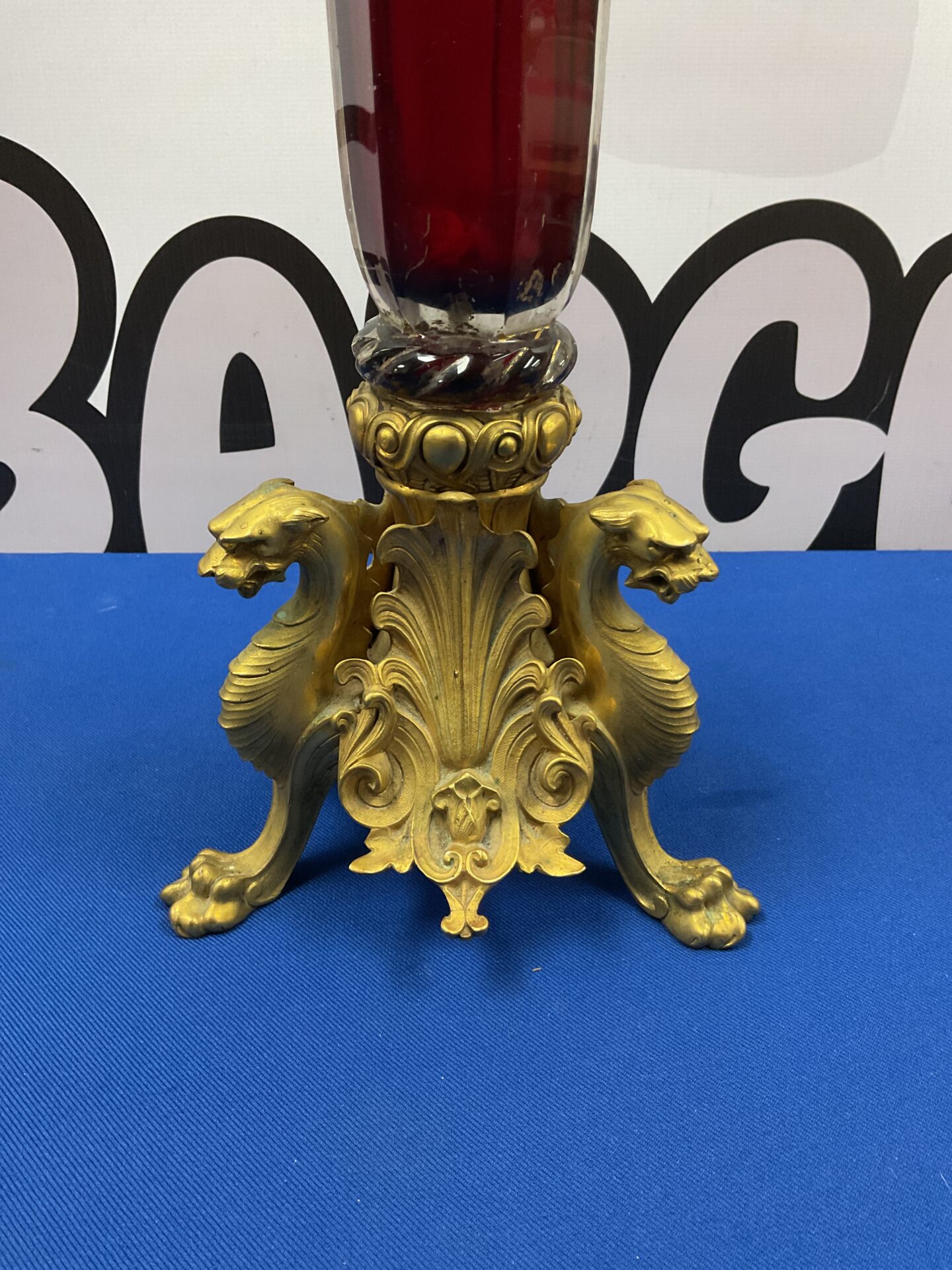 This striking Victorian epergne features a vibrant ruby red trumpet-shaped vase, beautifully contrasting with the ornate brass base. The base is intricately designed with lion heads and clawed feet, adding a touch of regal grandeur. Standing at 20 inches tall, this epergne would have been a prominent centerpiece on a dining table, intended to display fruits, flowers, or other decorative items.