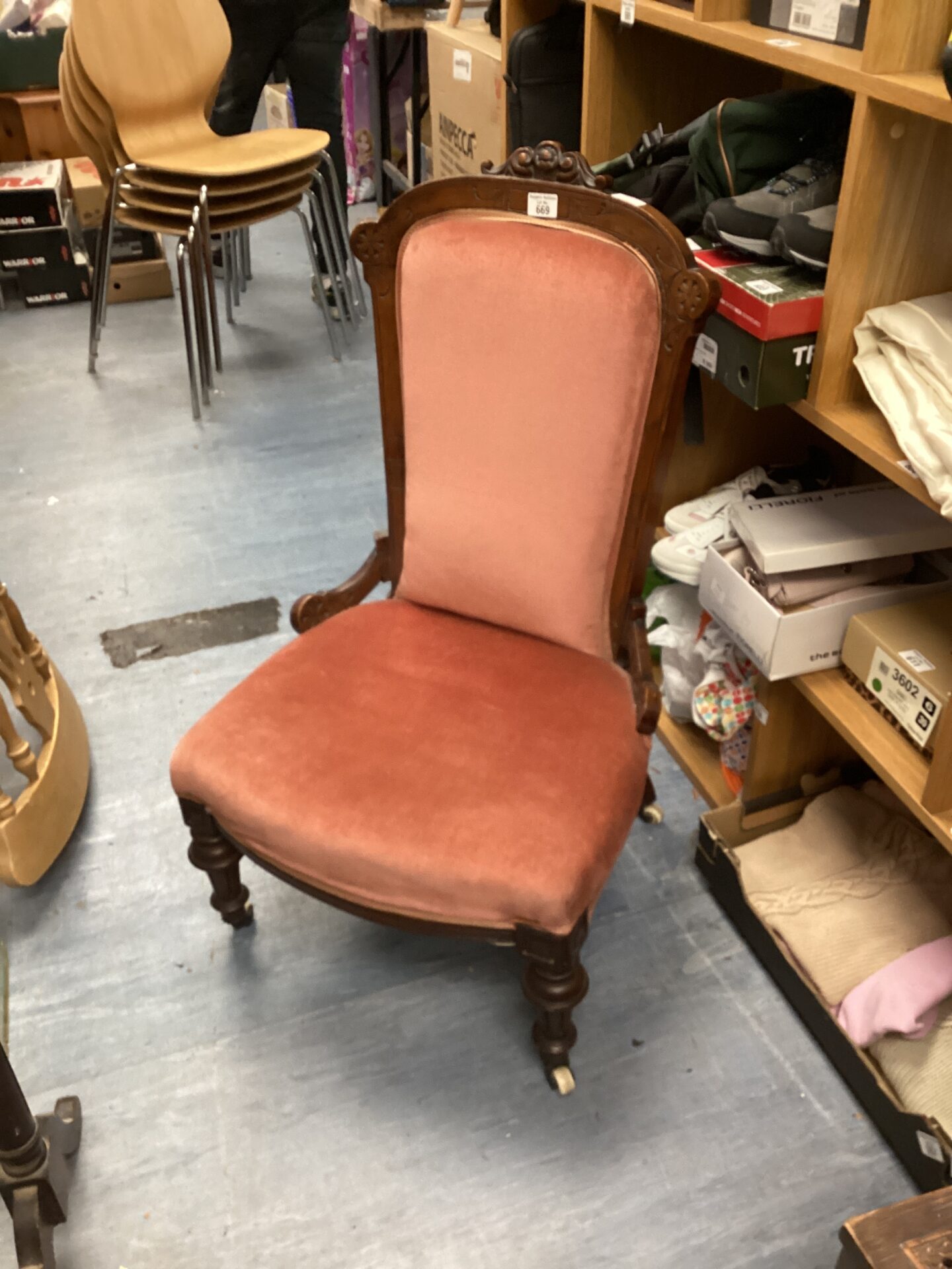 This is a Victorian-era nursing chair, likely dating from the mid-to-late 19th century. The chair features a gently curved backrest and upholstered seat, providing comfort and support. Constructed from mahogany, the chair exhibits classic Victorian detailing, including carved accents and turned legs. This style of chair was commonly used for feeding or tending to infants, hence the name “nursing chair”.