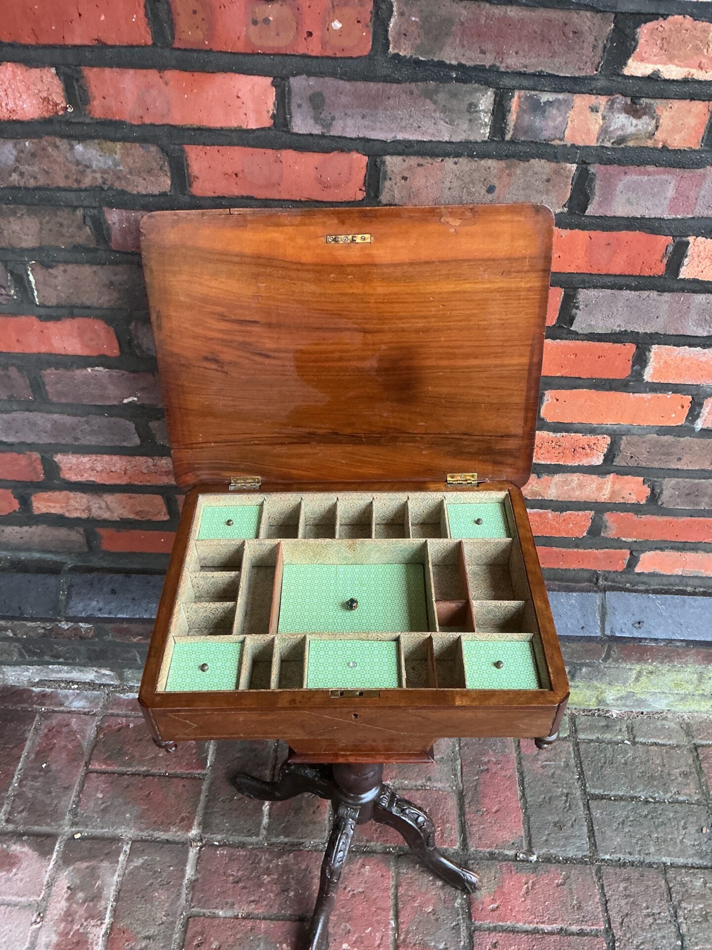 This sewing box exhibits signs of age and use, consistent with its antique status. The hinge requires a pin, and there may be minor wear to the veneer. Despite these minor imperfections, the box remains a desirable piece for collectors of Victorian sewing furniture or those seeking a unique and decorative item. The box’s original compartmentalised interior adds to its appeal and historical significance.