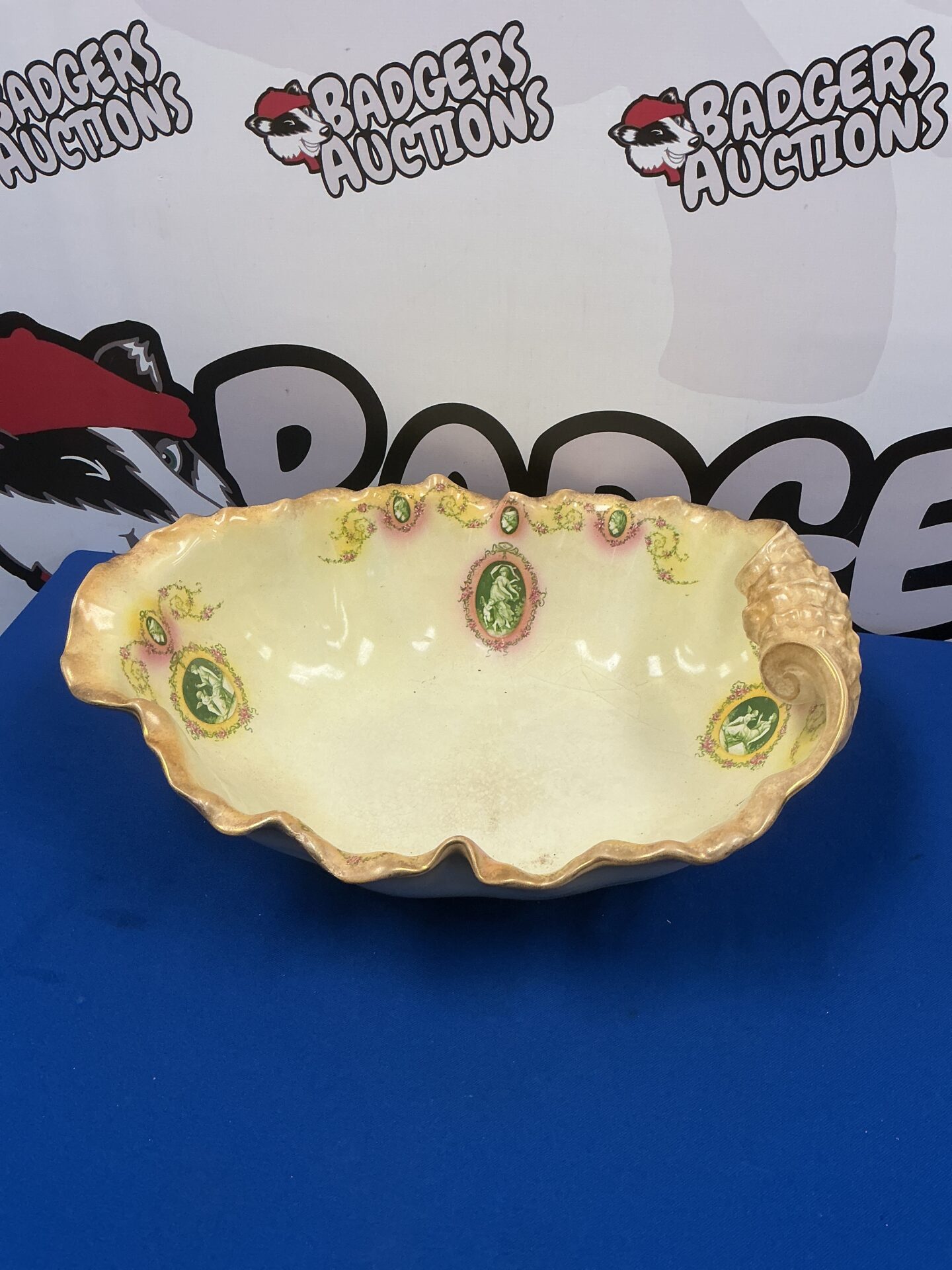This antique porcelain bowl shows signs of age and wear, consistent with its Victorian origins. There may be minor imperfections, such as slight crazing to the glaze or minor wear to the embossed details, which add to its character and authenticity. This bowl would be a desirable addition to a collection of Victorian porcelain, antique decorative arts, or shell-shaped ceramics, appealing to collectors and enthusiasts of the period.