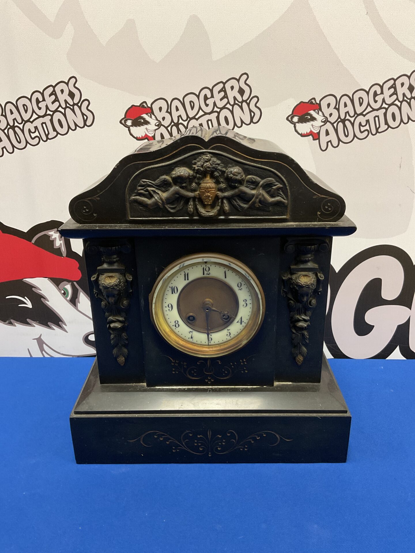 This striking mantle clock features a black slate case adorned with detailed cast iron ornamentation, including cherubic figures and floral motifs. The clock face is white enamel with black Roman numerals and delicate hands. The architectural design, with its arched top and fluted columns, is characteristic of Victorian-era craftsmanship, intended to be a focal point in a home’s décor.