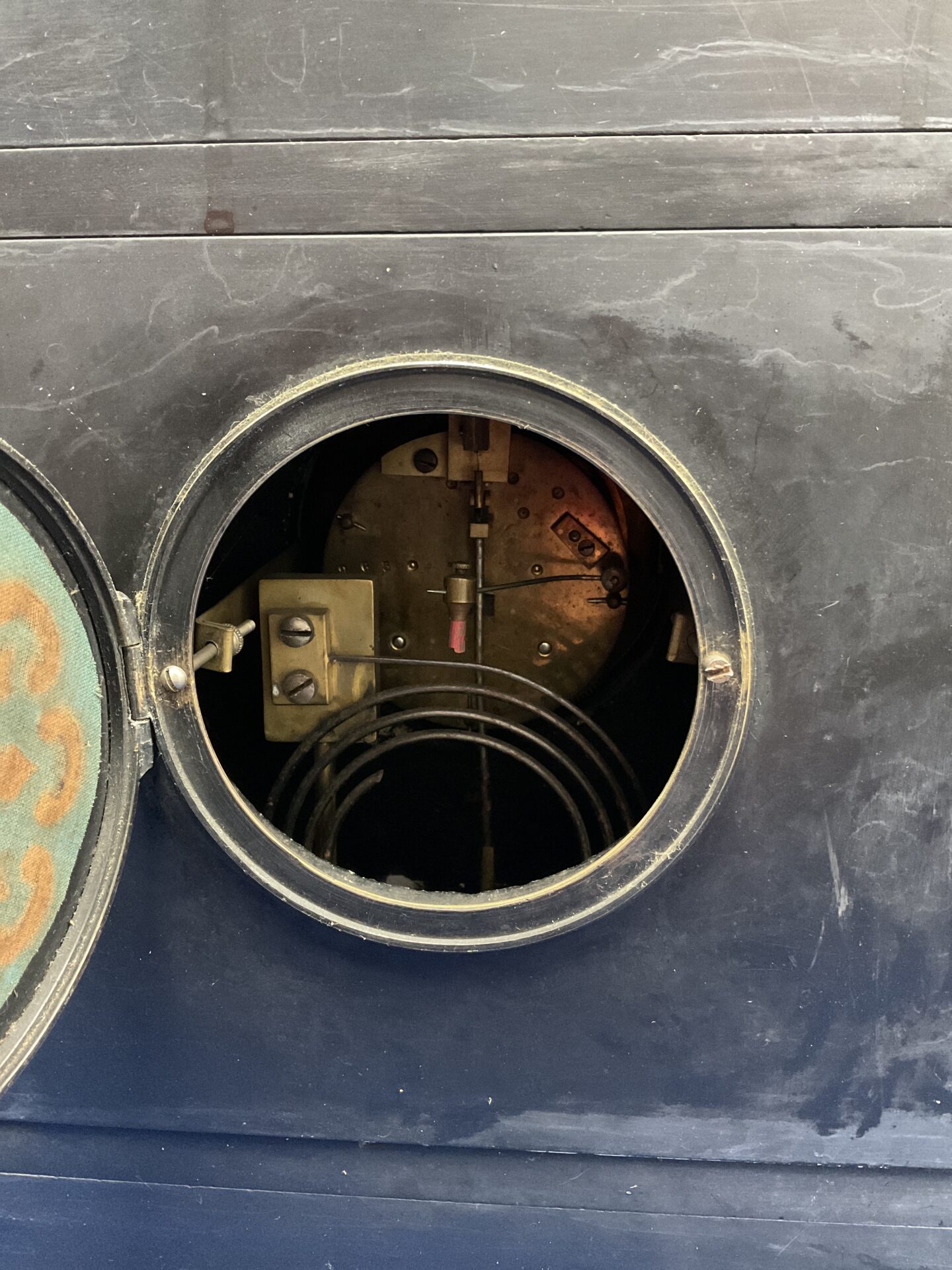 This clock presents as a display piece, and its internal mechanisms have not been assessed for functionality. The slate case exhibits signs of age and wear, which are consistent with its antique status. Collectors and enthusiasts will appreciate the clock’s aesthetic appeal and its representation of Victorian design, making it a desirable addition to a collection or a unique decorative element.