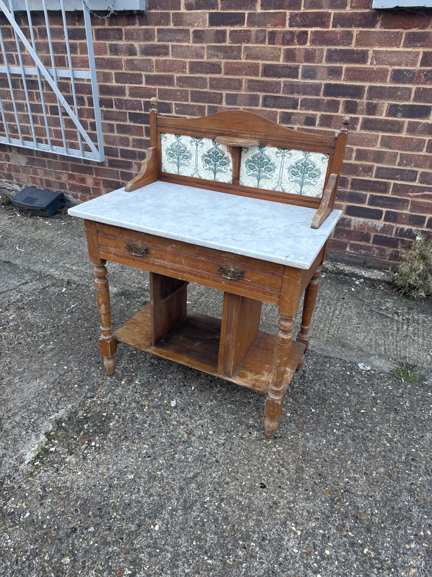 This charming Victorian wash stand features a beautiful marble top and a decorative tile backsplash. Constructed from wood, it offers a practical and stylish solution for a bedroom or hallway. The stand includes a lower shelf for storage, enhancing its functionality and making it a versatile piece for any vintage-inspired interior.