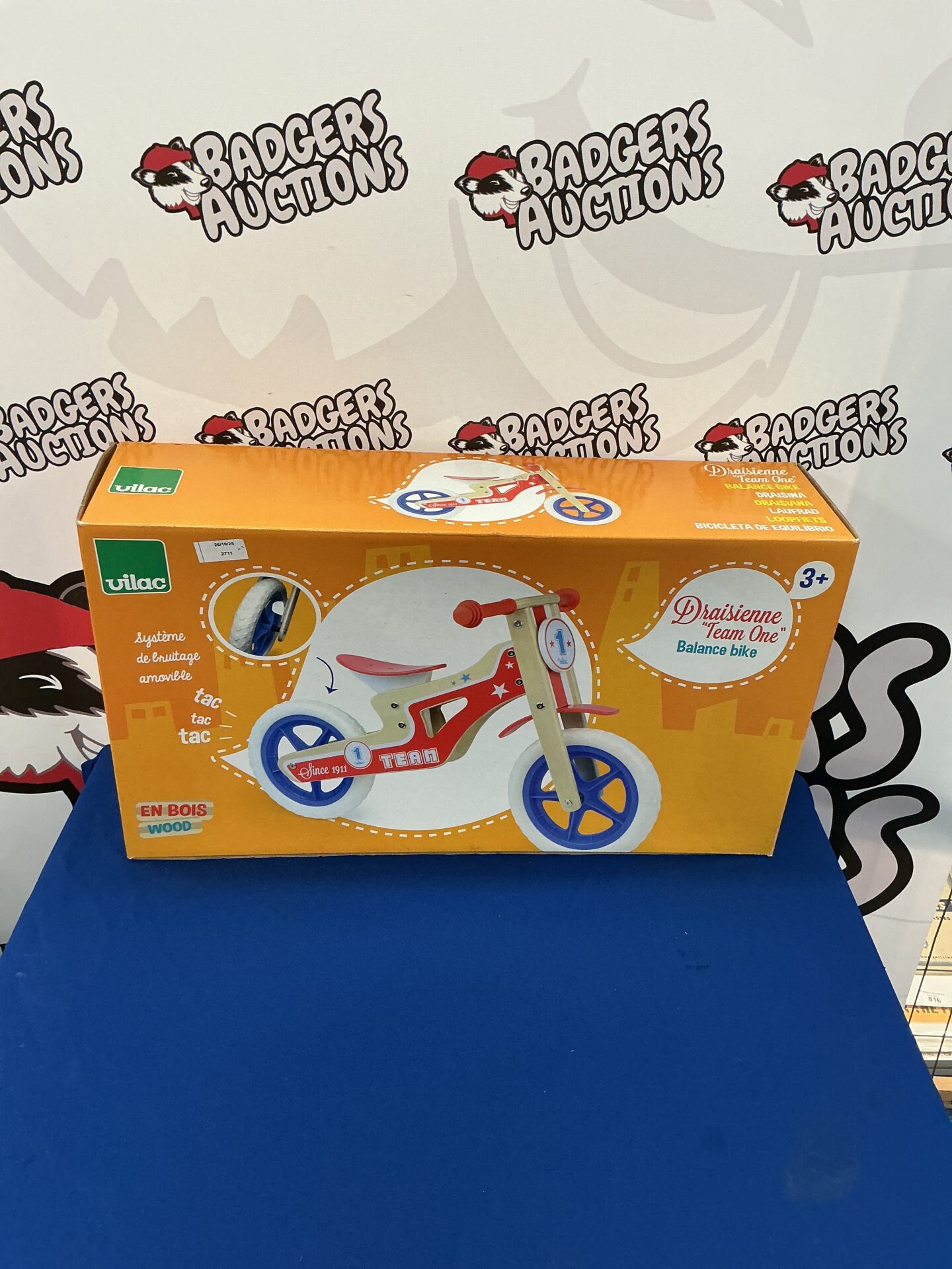 This charming balance bike by Vila is designed to help young children develop balance and coordination. Crafted from wood, this bike features a classic design with a natural finish. It’s a delightful way to introduce children to the joy of riding, fostering independence and confidence as they learn to steer and balance.