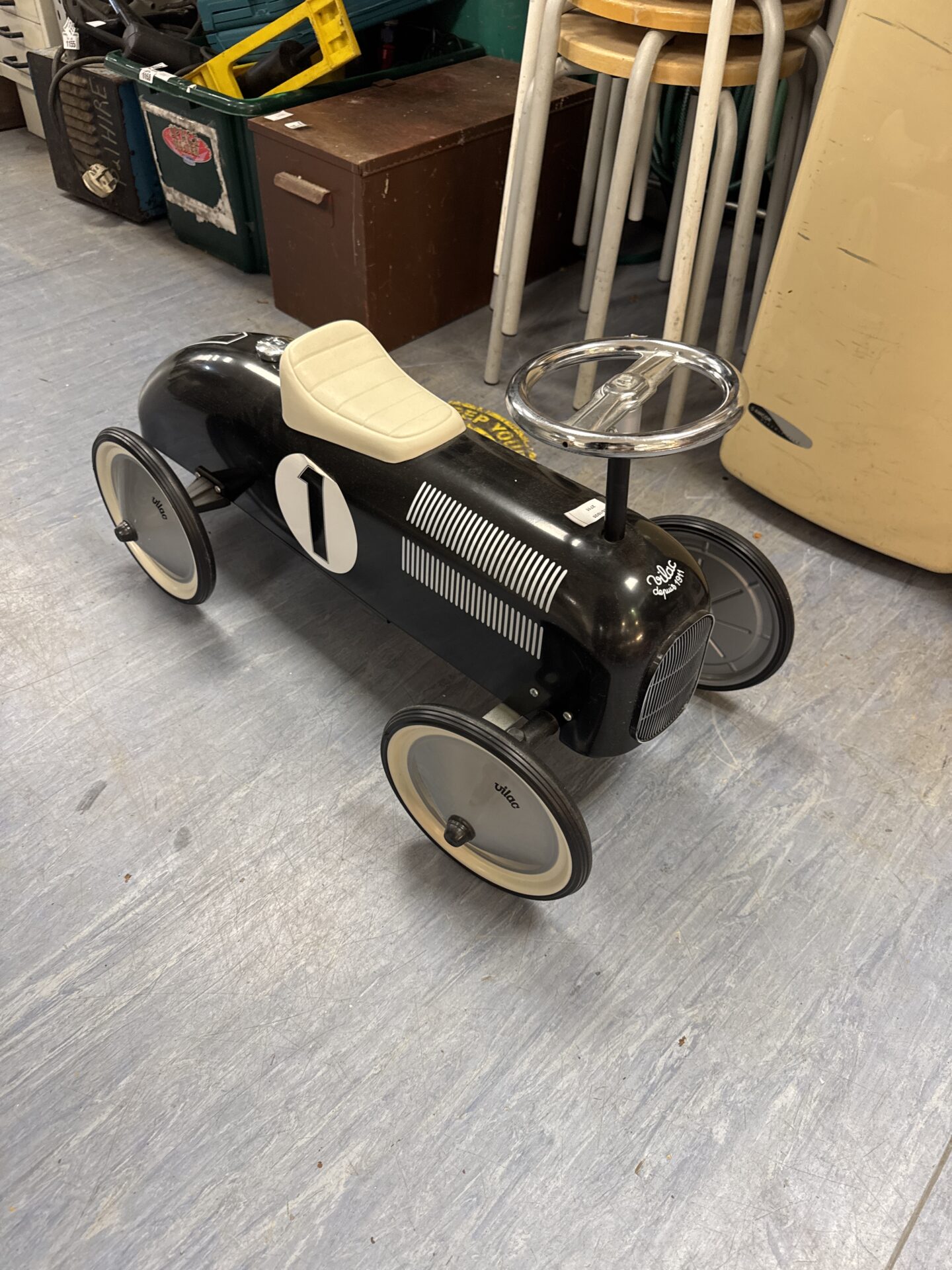 This Vilac ride-on car is in good vintage condition, showing signs of gentle wear consistent with age and use. It would make a wonderful addition to a collection of vintage toys or a delightful gift for a child. The quality craftsmanship and timeless design of Vilac toys make them highly sought after by collectors and enthusiasts.