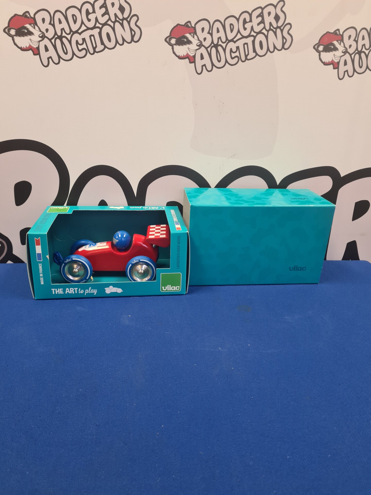 This Vilac race car is new in its original packaging, making it a highly desirable item for collectors of vintage toys. The pristine condition and original box add to its value and appeal. This piece would be a wonderful addition to any collection of French toys or a delightful gift for a child who appreciates classic, quality playthings.