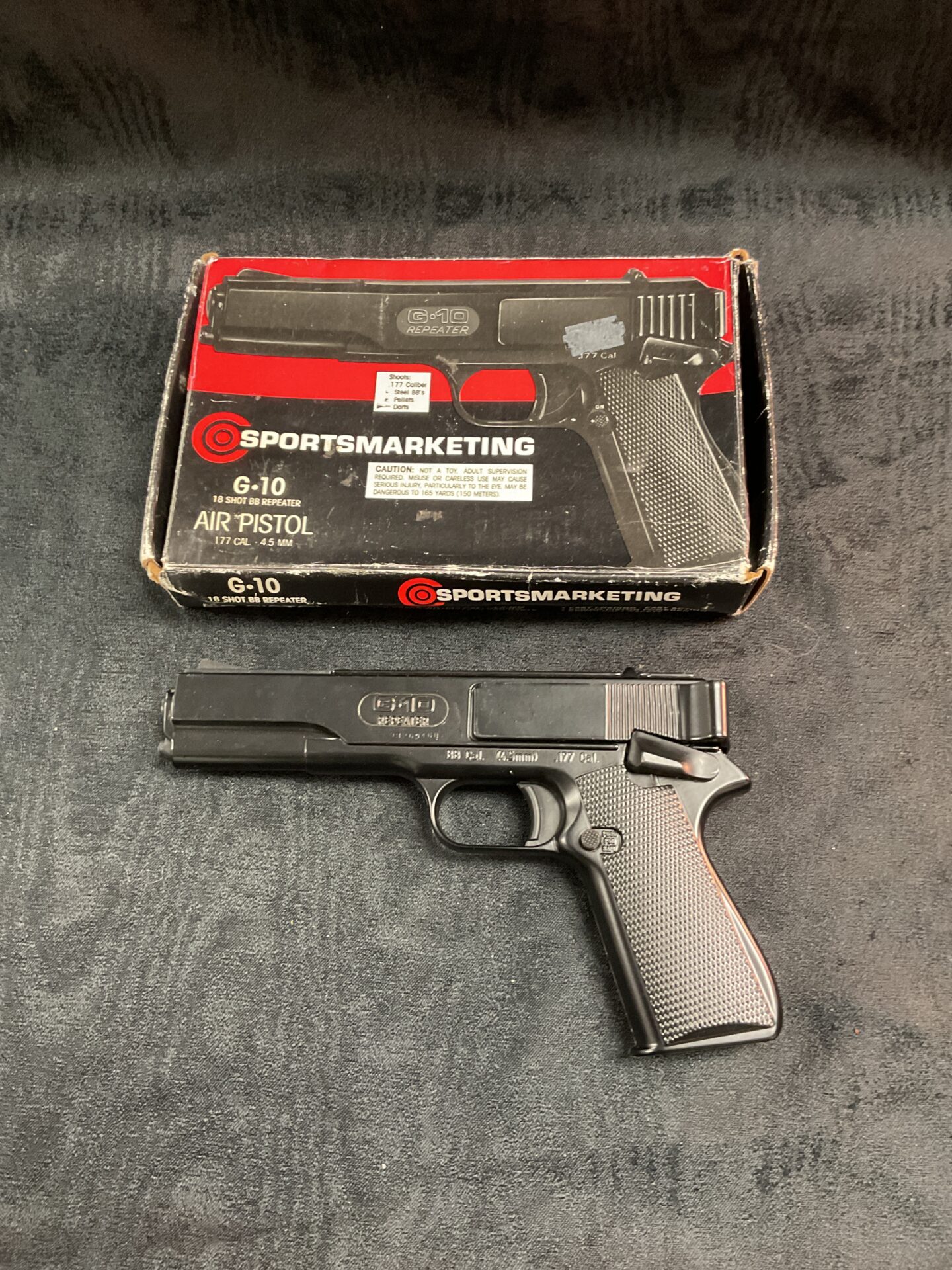 This is a vintage Sportsmarketing G10 air pistol, a classic example of a retro airgun. This pistol features a realistic design, mimicking the look of a firearm, and was likely intended as a toy or for target practice. The G10 model is known for its distinctive styling and is a popular item among airgun collectors.