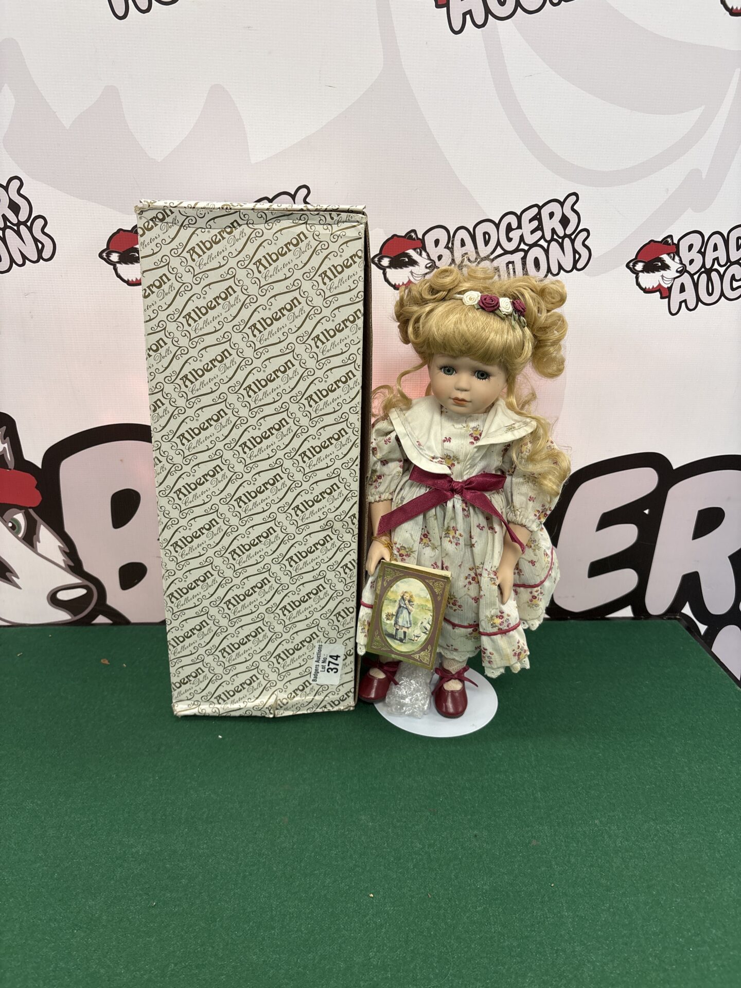 This is a vintage Alberon Mimi doll, a charming porcelain figure presented in its original box. The doll exhibits the delicate craftsmanship characteristic of Alberon dolls, with detailed facial features and a classic design. This particular model is a delightful example of vintage doll artistry, likely intended as a collectible or display piece.