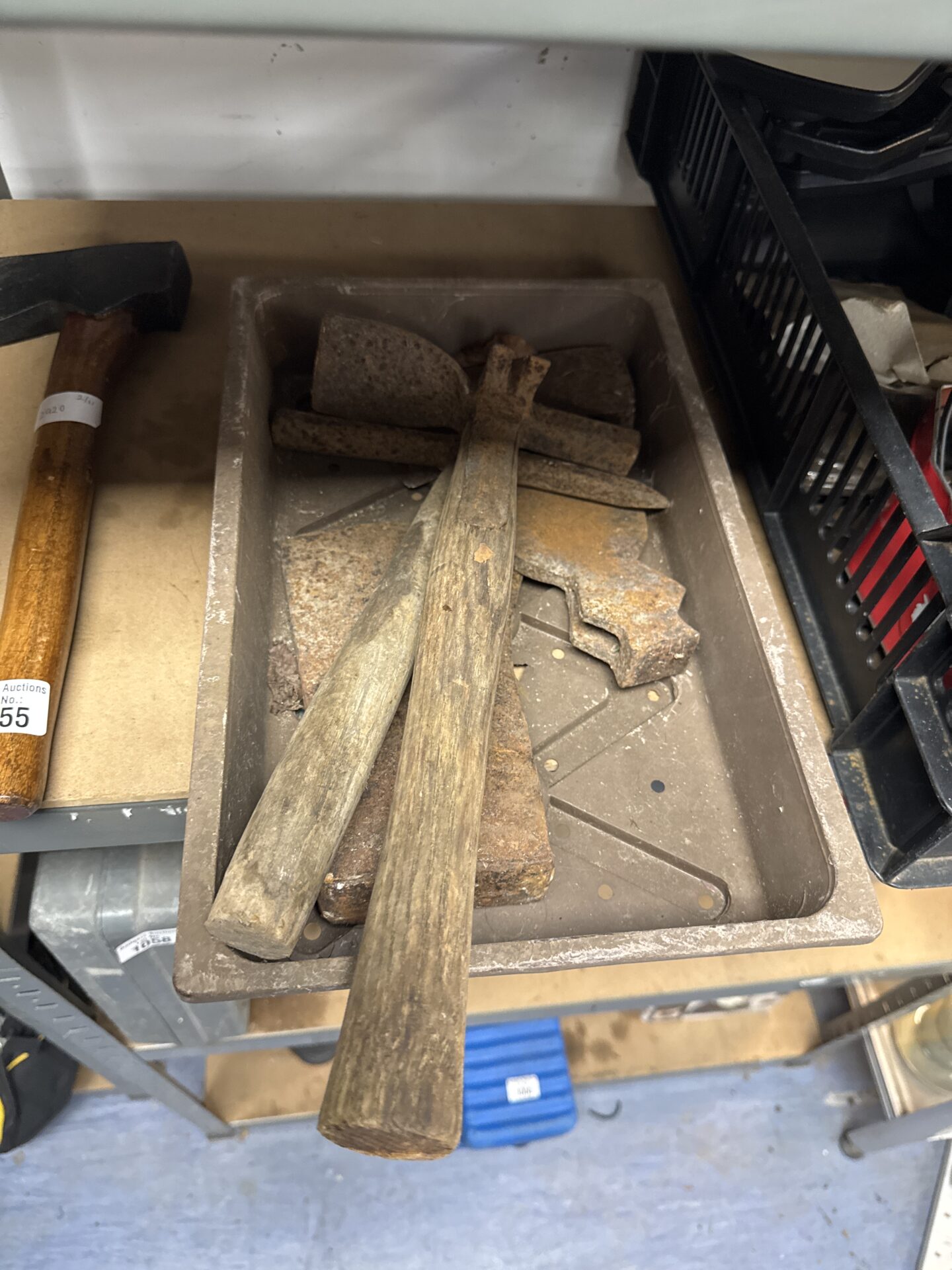 This lot comprises a selection of vintage axe heads, likely dating from the early to mid 20th century. The heads exhibit varying degrees of wear and patina, indicative of their age and use. The different shapes and sizes suggest they were employed for a range of tasks, from felling trees to splitting wood, and potentially for more specialised work.