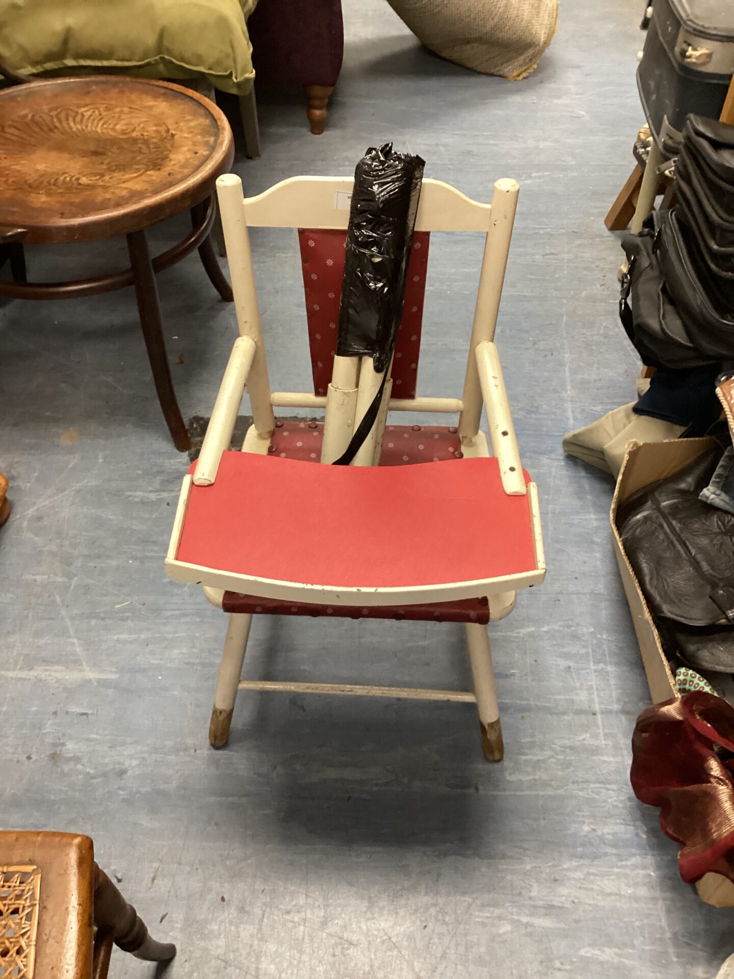 This charming vintage baby high chair dates to the 1950s. Constructed from wood, it features a red seat and a simple, functional design typical of the era. The chair’s construction suggests it was intended for everyday use, providing a safe and comfortable place for a young child to sit during mealtimes.