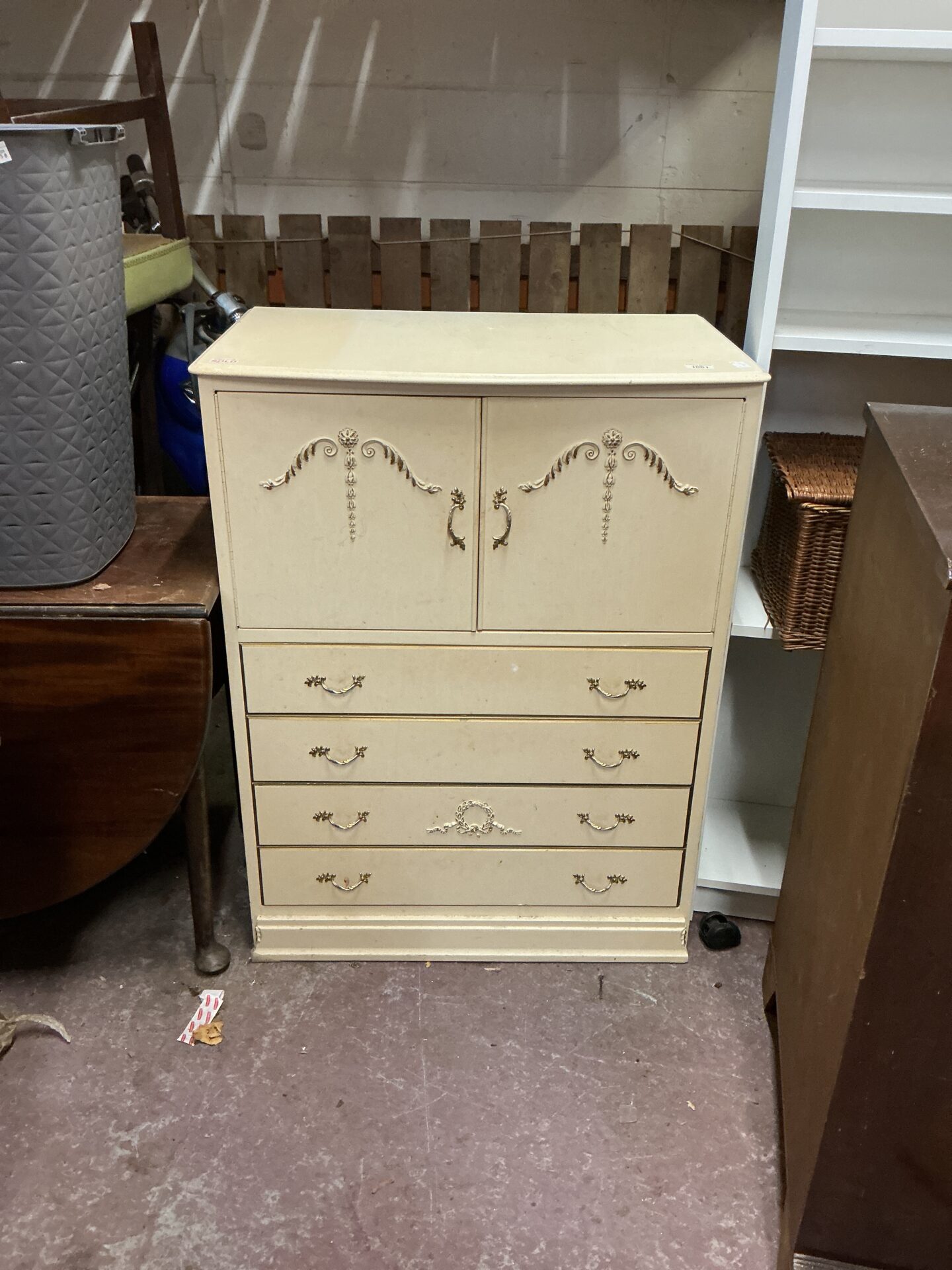 This is a vintage bedroom drawer unit, likely dating from the mid-20th century. The unit features four drawers, offering ample storage space for clothing or other bedroom essentials. The painted finish gives it a charming, shabby chic aesthetic, and the unit’s construction suggests it was built to last.