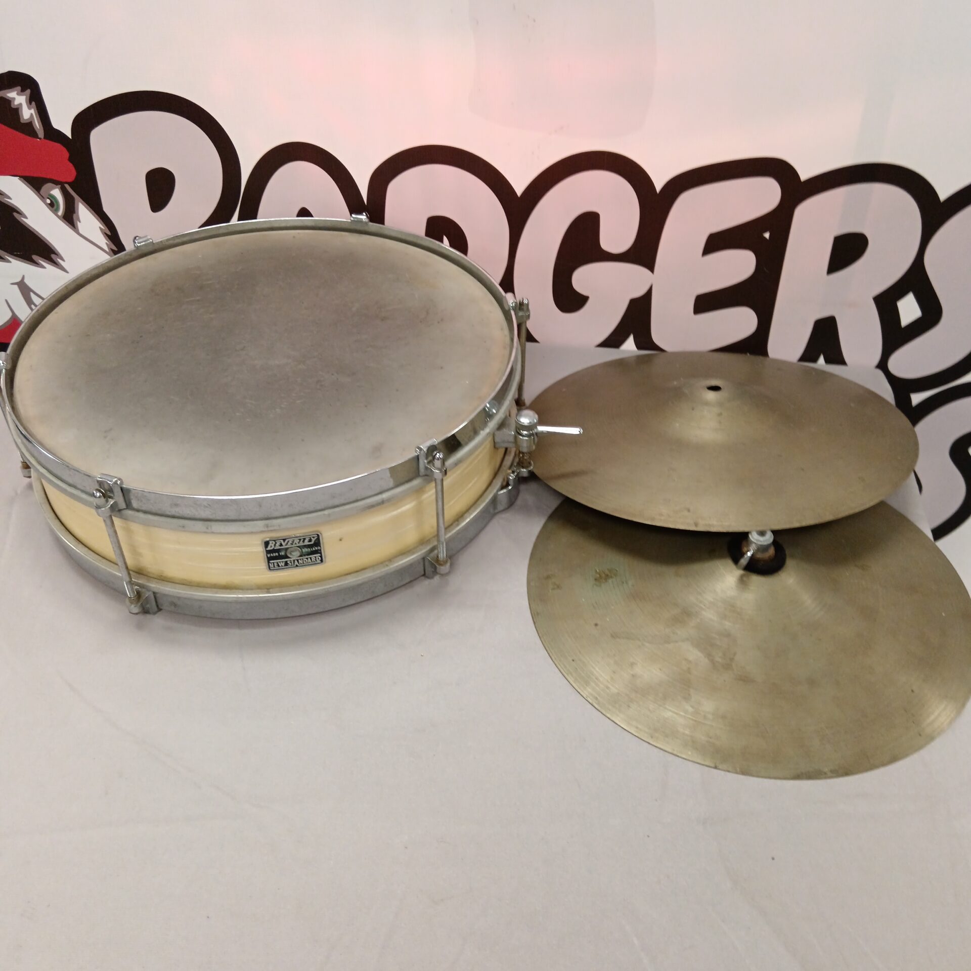 This vintage Beverley snare drum is a classic piece of mid-century percussion. Featuring a wooden shell and chrome hardware, this drum is ideal for collectors or musicians seeking a unique vintage sound. A compact size makes it perfect for jazz, pop, or early rock and roll.