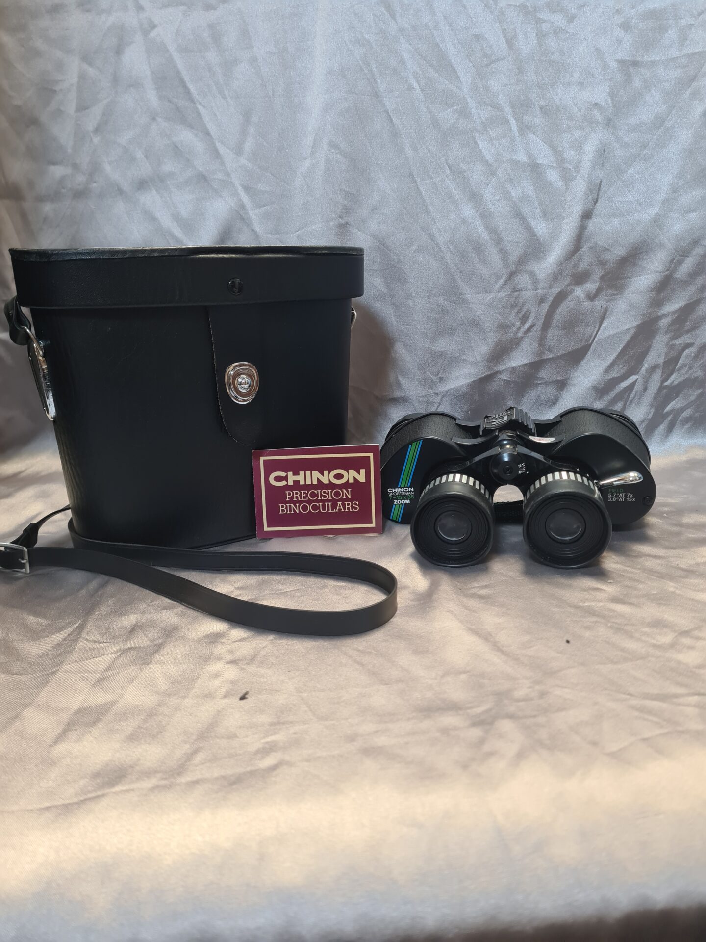 A vintage pair of Chinon Sportsman 7-15×35 zoom binoculars, complete with a fitted case. These classic binoculars offer adjustable magnification for versatile viewing. A desirable collectible for enthusiasts of vintage optics and sporting goods.