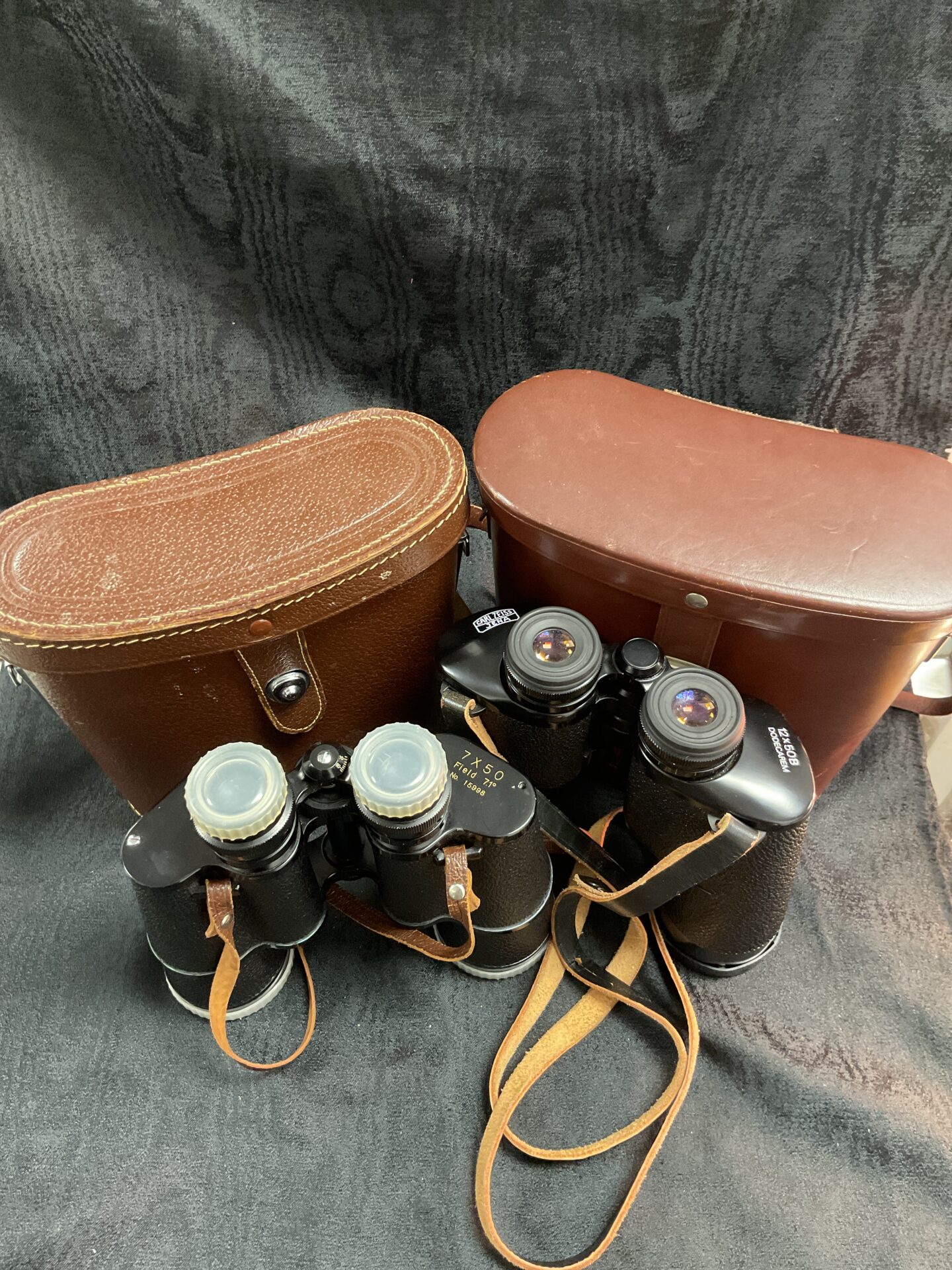 This lot comprises two pairs of vintage binoculars. One pair is a Carl Zeiss 12x50B Dodecarem, a classic German optical instrument known for its quality and clarity. The second pair are Japanese 7×50 field glasses, likely of military or nautical origin. Both pairs are presented with their original carrying cases, offering a glimpse into the history of optical technology and its applications.