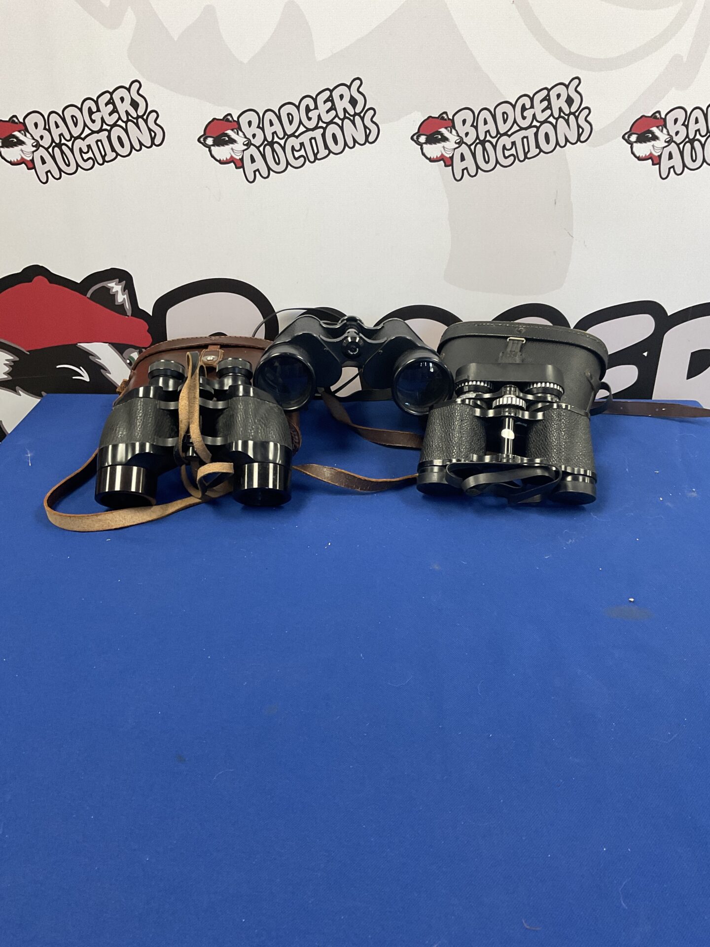 This lot comprises a collection of three pairs of vintage binoculars. One pair appears to be branded ‘Boots’, suggesting a quality manufacture. The binoculars exhibit classic designs typical of their era, featuring adjustable eyepieces and a central focusing wheel. These optical instruments likely served purposes ranging from birdwatching and sporting events to military or nautical use.