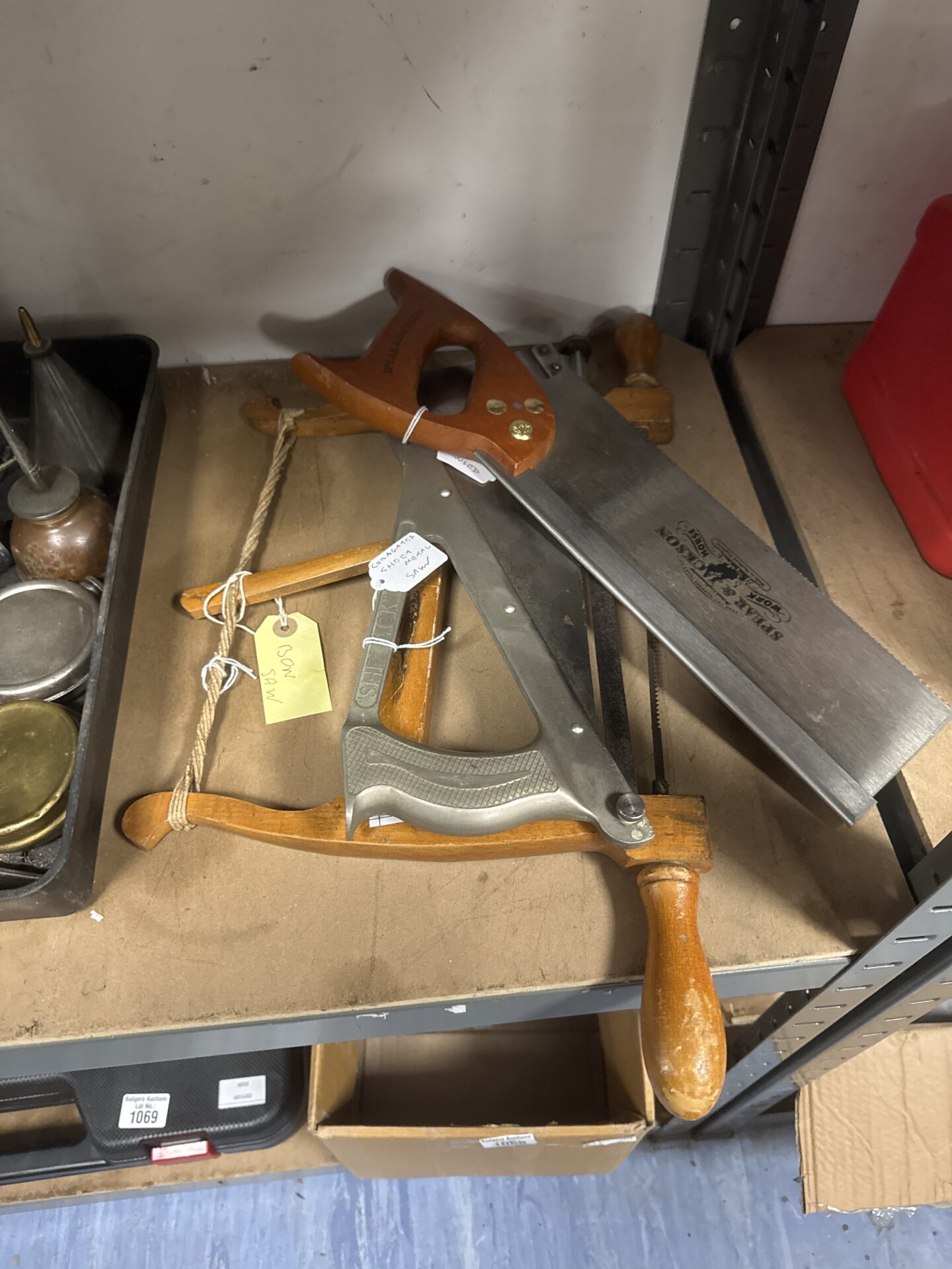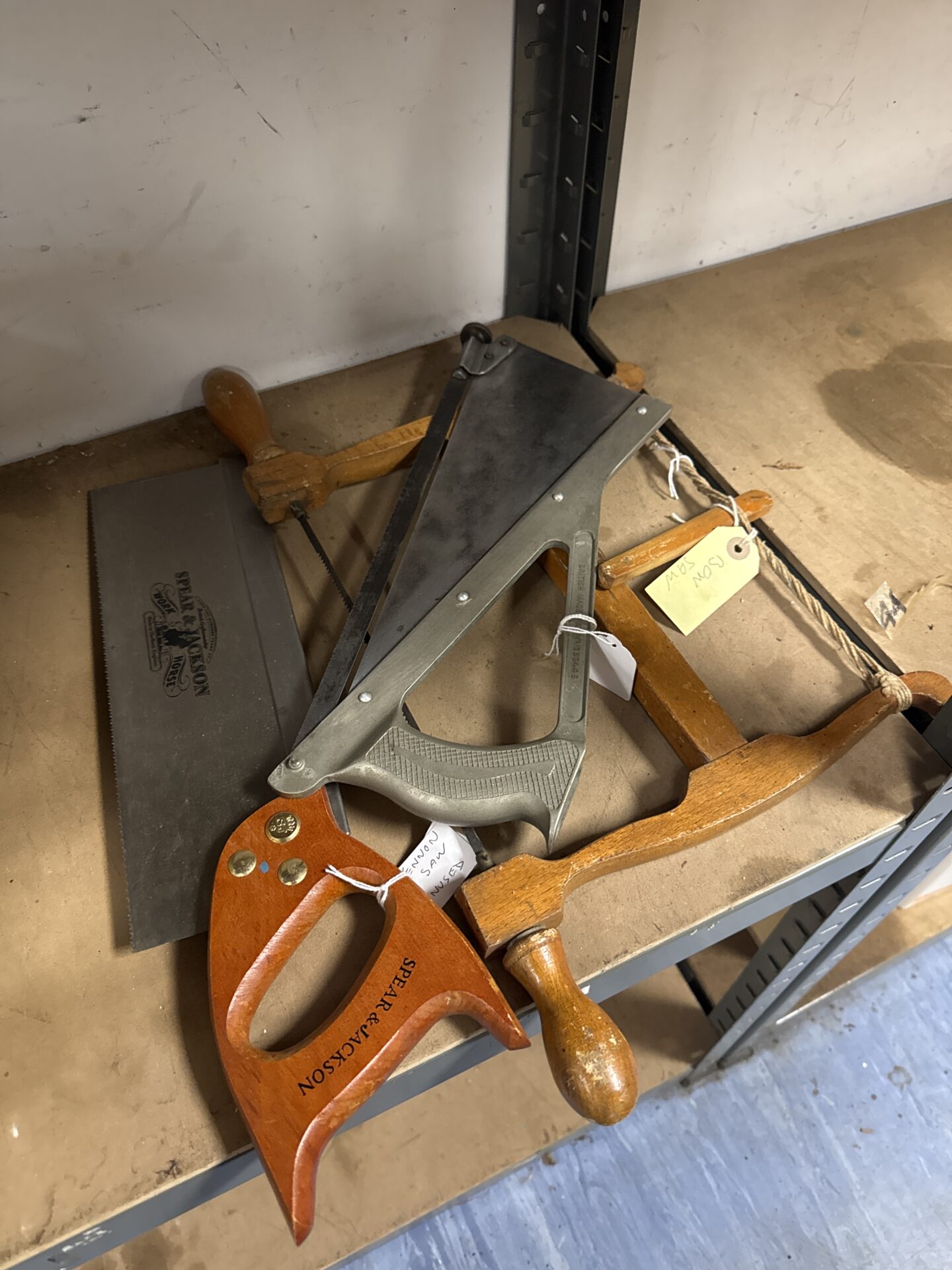 This lot features a vintage bow saw accompanied by a Spear & Jackson tennon saw. The bow saw exhibits a traditional design, likely crafted for cutting curves and intricate shapes in wood. The included Spear & Jackson tennon saw is a high-quality tool, known for its precision and durability, and was commonly used for creating tenon joints in woodworking projects.