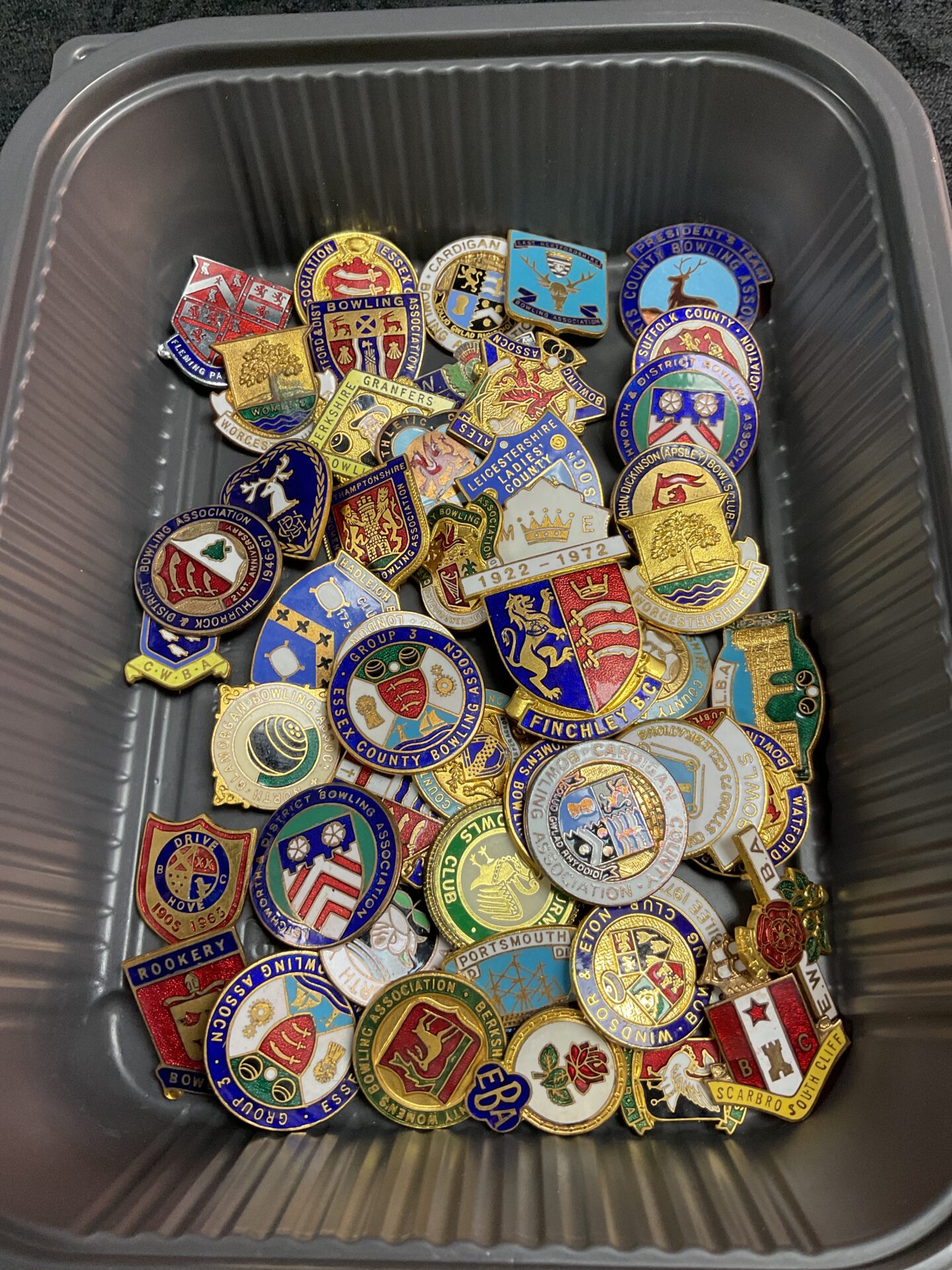 This lot comprises forty-eight vintage enamel pin badges representing various bowling clubs. The badges showcase a diverse range of club emblems and colours, reflecting the history and identity of each club. These badges likely date from the mid to late 20th century, offering a glimpse into the sporting culture of the era.